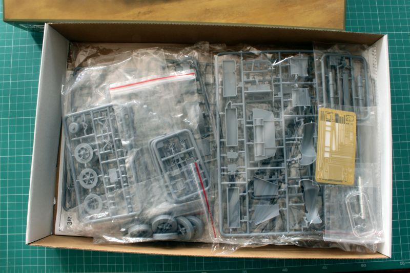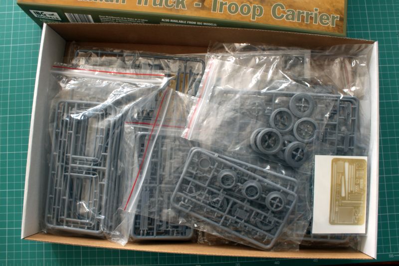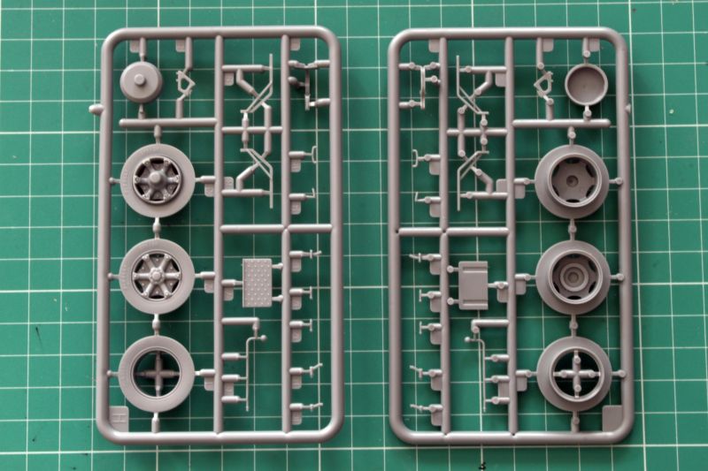 Oba zestawy zapakowano w dość spore i solidne pudełka z efektownymi boxartami. Jeśli chodzi o szatę graficzną nic tu się nie zmieniło, producent trzyma się dawno sprawdzonego schematu. Natomiast zawartość obu pudełek jest dosłownie wypełniona po brzegi, ponieważ wojskowe ciężarówki to ulubiona tematyka warszawskiego producenta, także i tym razem IBG Models nie dało sobie taryfy ulgowej oferując zestawy umożliwiające wykonanie bardzo szczegółowych modeli praktycznie tylko w oparciu o zawartość pudełek. Każdy z nich liczy dobrze ponad setkę elementów plastikowych, dlatego, też nie będę bawić się w liczenie części ograniczę się do podania ilości ramek. W przypadku nosiciela haubicy jest ich 17, natomiast w przypadku klasycznego samochodu ciężarowego jest ich aż 24. Do tego w każdym zestawie znajduje się osobna torebka z siedmioma polistyrenowymi oponami.