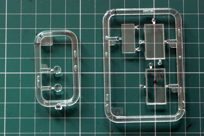 Oba zestawy posiadają także elementy przezroczyste. Ramka L jest wspólna dla obu zestawów i zawiera szkła reflektorów. Ramka M zawiera oszklenie szoferki i wchodzi w skład jedynie zestawu samochodu ciężarowego. Także tu nie można przyczepić się do jakości wykonania tych elementów. Szkło jest cienkie i przejrzyste, przednie szyby szoferki maja także ładnie odwzorowane zawiasy.
