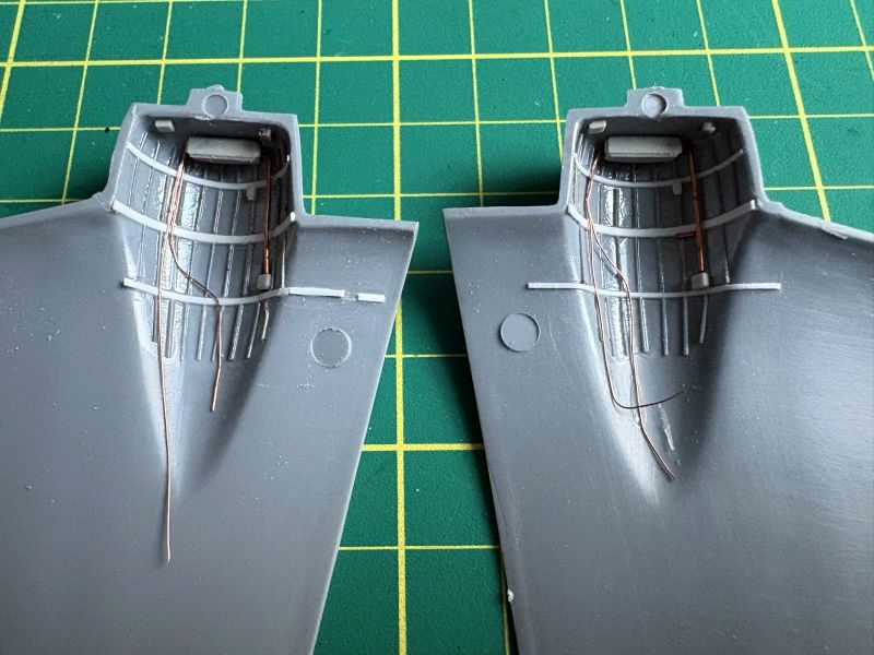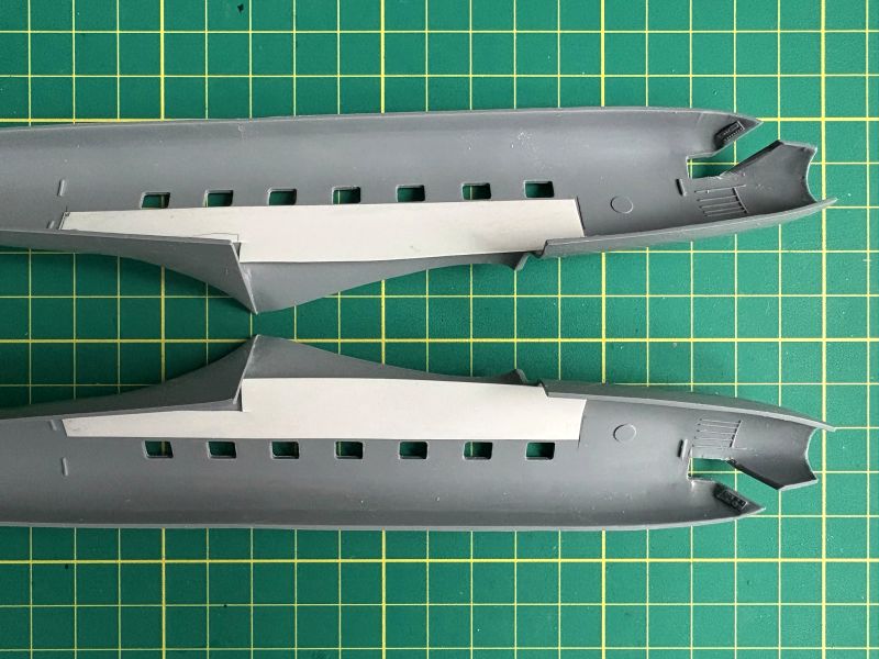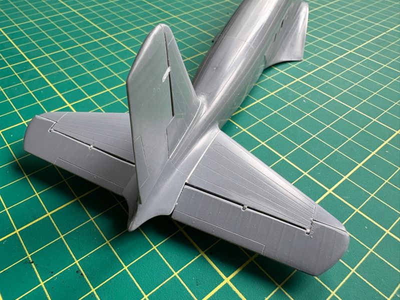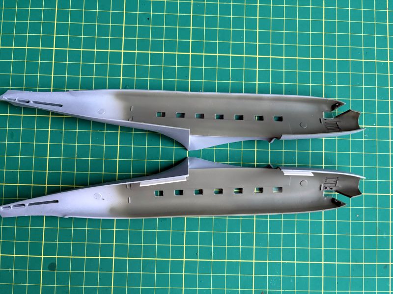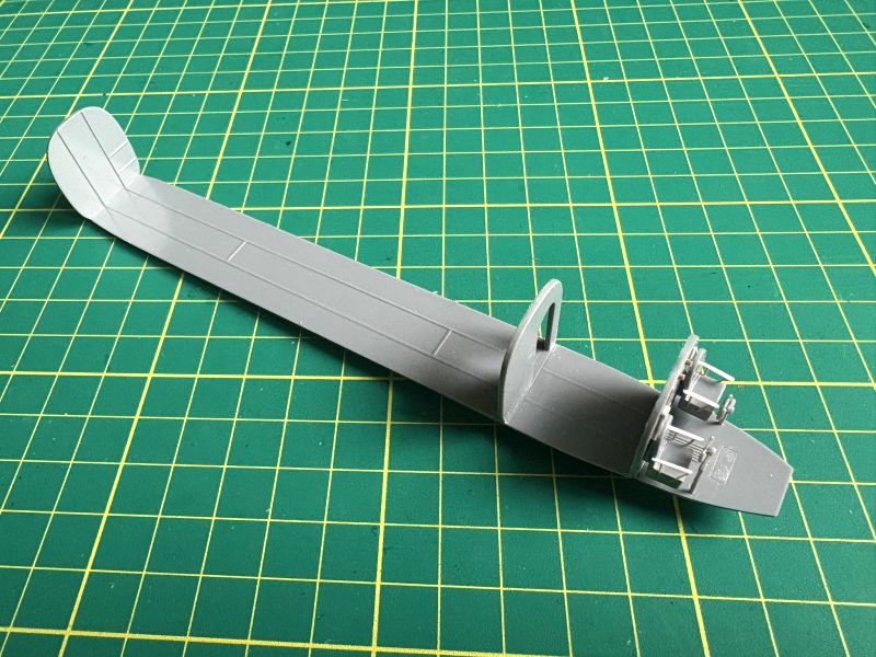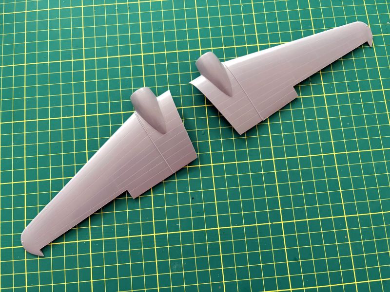 Bardzo obawiałem się także spasowania, a właściwie braku spasowania górnych części skrzydeł z kadłubem. Nawet rozważałem możliwość przyklejenia ich w pierwszej kolejności, aby nie postały jakieś trudne do usunięcia szpary. Okazało się, że wszystko pasuje do siebie idealnie, mogłem skleić skrzydła zgodnie z instrukcją. Wyciąłem jedynie lotki oraz dorobiłem wnęki pod zewnętrzne klapy.