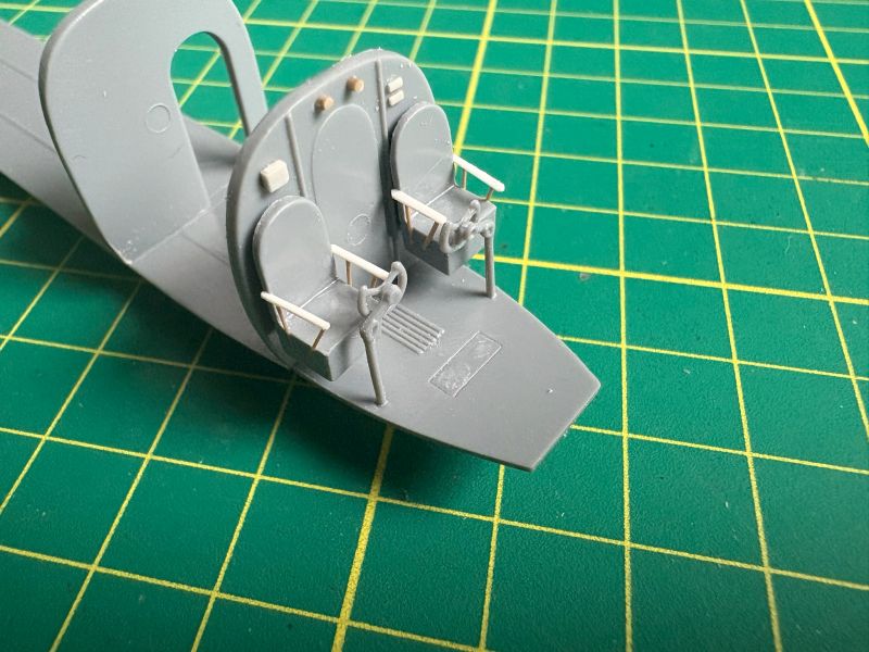 Przystępując do budowy byłem przegotowany na dość ciężką przeprawę, dosłownie modelarskie „krew, pot i łzy”. Model nie najnowszy, wykonany w dodatku w technologii short run i to w najczystszej postaci. Jakież było moje zdziwienie, jak po wycięciu z ramek i dokładnym oczyszczeniu poszczególnych elementów, zwłaszcza ich miejsc styku z innymi elementami, okazało się, że wszystko pasuje do siebie niemal idealnie. Pozwoliło mi to od razu, praktycznie z marszu wypracować sobie koncepcję budowy modelu. Po pierwsze, odpuściłem sobie odtwarzania wnętrza kabiny pasażerskiej. Drzwi i tak były zamknięte a przez okienka nie było wiele widać. Z pasków polistyrenu wykonałem jedynie ścianki, żeby nie mieć żadnych prześwitów w rejonie przejścia skrzydło – kadłub. Nieco więcej uwagi poświęciłem kabinie pilotów, ale też bez przesady. Dokleiłem tylko tyle co widać na zdjęciach.