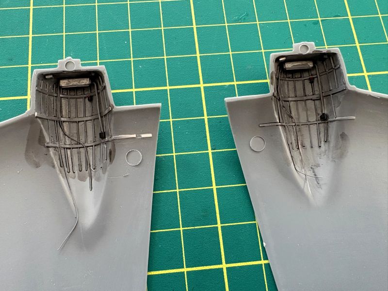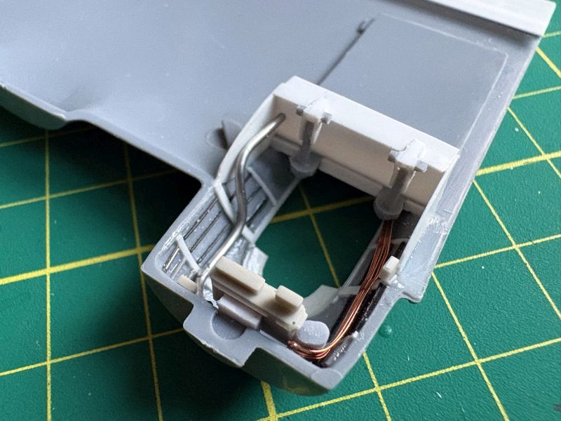 Piłowania i poprawiania nadal było mi mało, więc dorobiłem wnętrza luków podwozia oraz strukturę konstrukcji klap. Oczywiście nie trzeba tego robić, ja osobiście chciałem sprawdzić, ile się z tego zestawu da wycisnąć. Okazało się, że sporo, z tego, co przewidział producent zostawiłem jedynie sufity luków podwozia, zresztą po odcięciu przednich części z wykuszami dla kół. Cała resztę, na podstawie posiadanych zdjęć odtworzyłem, wykorzystując głównie zawartość mego pudła ze złomem. Z efektu jestem zadowolony.