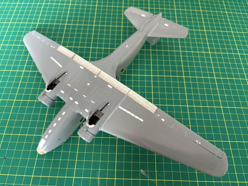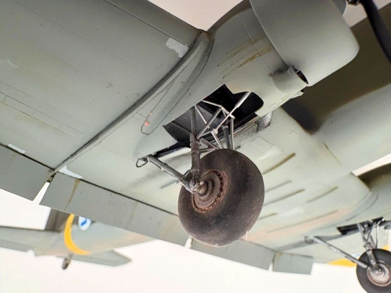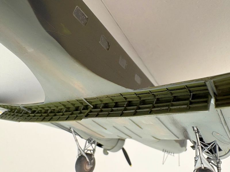 Model skleiłem w całość. Niewielkie szczeliny w niektórych miejscach łączenia wypełniłem akrylową szpachlówką Vallejo i podejrzewam, że gdybym nic nie kombinował z wnętrzem luków podwozia, to by się bez tego obeszło. Uzupełniłem także fakturę powierzchni o panele, które pominął producent, a które znalazłem w planach dołączonych do posiadanej przeze mnie monografii.