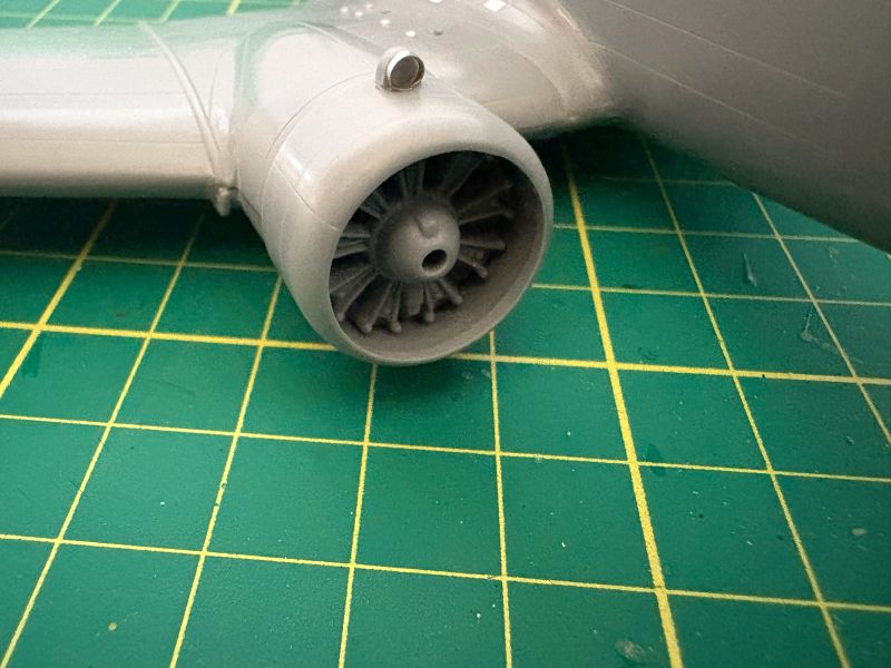 Jeszcze chciałbym zwrócić uwagę na dwie rzeczy. Po pierwsze, wspominana już przeze mnie fatalnie spasowana część nosowa. Wklejona uprzednio polistyrenową musiałem odkleić i zastąpić żywiczną. Po prostu wkleiłem nie ta co trzeba. Ta jest jeszcze gorsza i żałuję, że nie podkleiłem jej kawałkiem tworzywa, żeby nieco zwiększyć jej średnicę u podstawy i w ten sposób dopasować do średnicy kadłuba. Wyszło to tak sobie, zaś gdybym budował model w jakimś malowaniu w naturalnym metalicznym wykończeniu, to wyglądałoby to po prostu źle. Tu gorący apel do producenta, o wykonanie poprawnej części nosowej albo w przypadku dodatku do kolejnych zestawów, lub jako osobnego produktu. Druga sprawa to silniki. Te z zestawu nie wyglądają źle, ale nie należy ich przyklejać, tak jak sugeruje instrukcja, bo będą zbyt głęboko siedzieć w osłonach. Należy je przykleić bezpośrednio do osłon, tak jak to widać na zdjęciu po lewej stronie. Osłony są natomiast dobrze spasowane z gondolami i nie będzie problemu z ich poprawnym przyklejeniem.