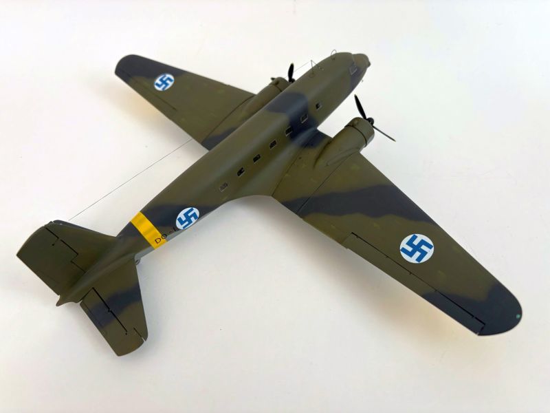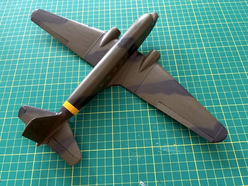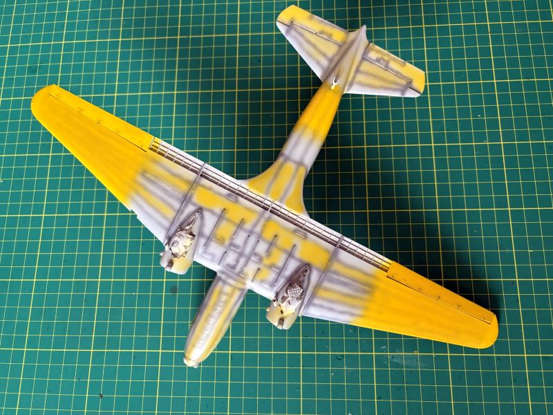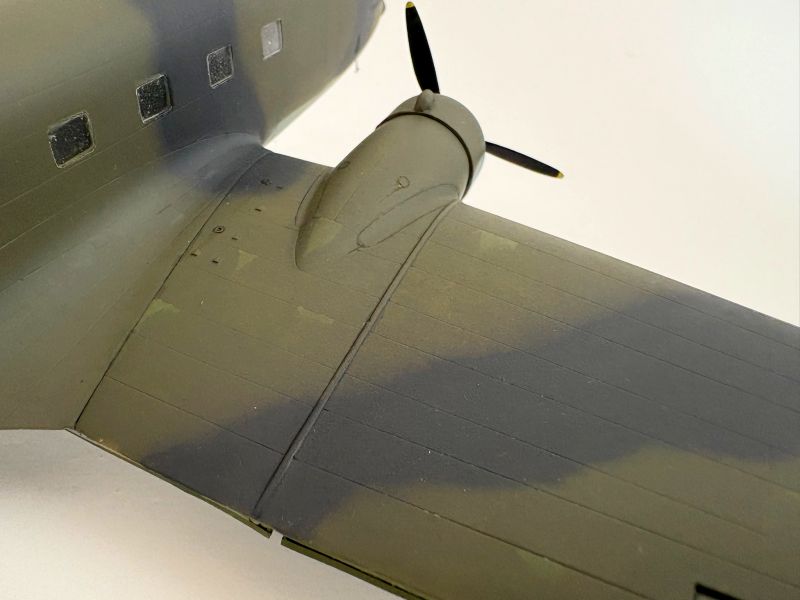 Ale po kolei. Zanim zacząłem je nanosić przykleiłem oczywiście kalkomanie, uprzednio gruntując model sidoluksem. Położyły się bezproblemowo, jedynie trochę zabawy było z tymi poprawnymi politycznie swastykami. Potem były ślady eksploatacji, które ograniczyłem jedynie do kilku zacieków przy silnikach, wlewach paliwa i na powierzchniach sterowych oraz przebarwieniach na poszczególnych kolorach kamuflażu. Całkowicie odpuściłem sobie odpryski lakieru, w końcu był to samolot dla VIP-ów.