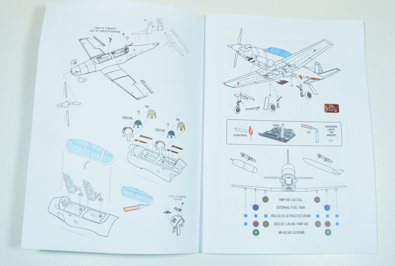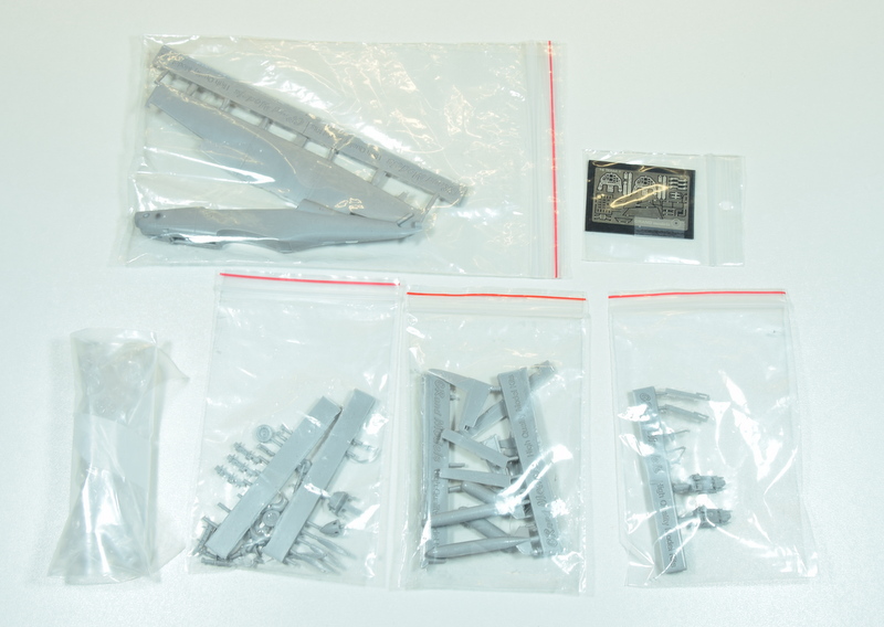 Tak nam się prezentuje zestaw zaraz po wypakowaniu z pudełka. Elementy żywiczne są pogrupowane w 5 woreczkach strunowych, w jednym znajduje się owiewka samolotu. Zawartość woreczków to 43 części żywiczne w kolorze szarym, dobrej jakości żywicy. Poziom szczegółów jest dość wysoki w wewnętrznych jak i zewnętrznych elementach modelu. Jedna blaszka fototrawiona na której znajduje się 26 części głównie elementów kokpitu, znajduje się też kilka zewnętrznych detali. Pokaźnej wielkości arkusz kalkomanii oraz instrukcja montażu i malowania zestawu w formie książeczki w kolorze.