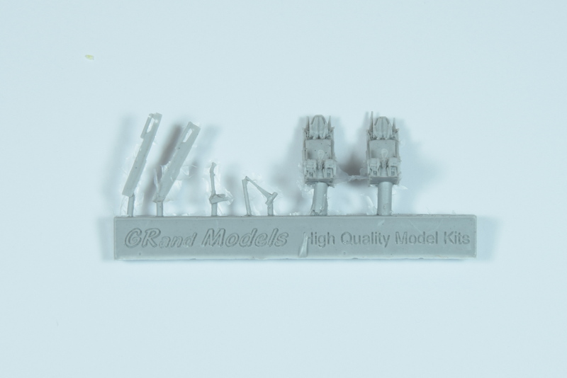 Elementy żywiczne wypakowane z woreczków strunowych pogrupowane na poszczególne sekcje budowy modelu. Ciekawym rozwiązaniem jest kadłub odlany w jednym kawałku bez dzielenia na dwie części, w którym w przedniej części jest zatopiony odpowiedniej wagi balast zapobiegający przeważaniu modelu na ogon. Co jest częstą bolączką modelarzy, zwłaszcza tych początkujących.