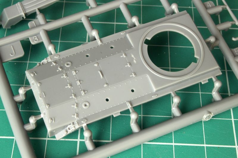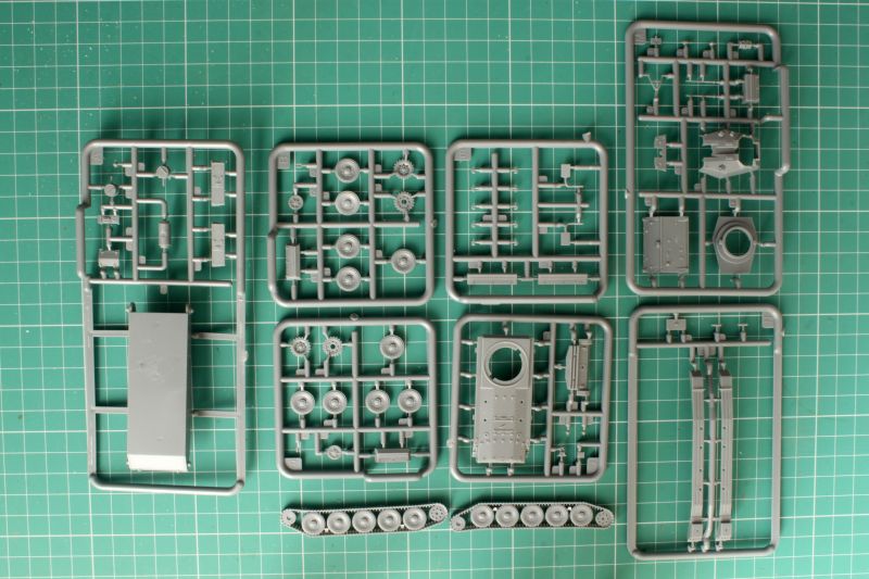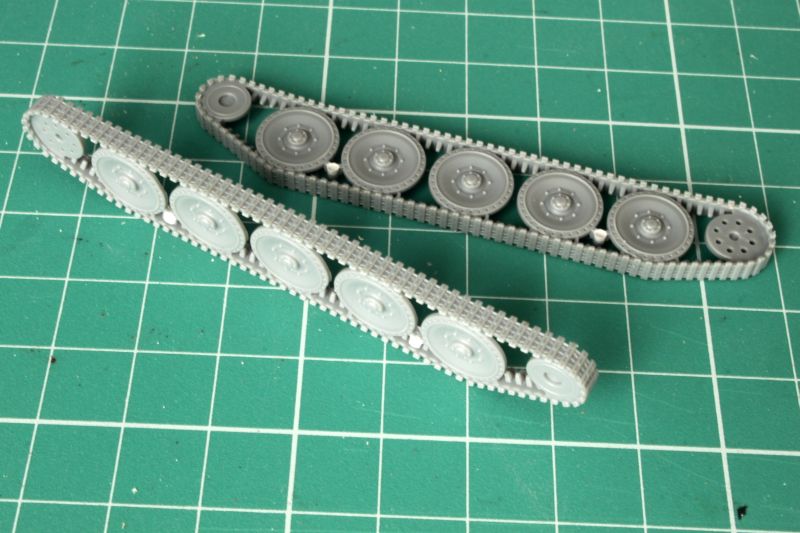 Koncepcja modelu oraz jakość wykonania w niczym się nie zmieniły. Obydwa modele składają się z kilkudziesięciu precyzyjnie wykonanych elementów odlanych z szarego plastiku. Wspólne są jedynie ramki A i B oraz koła wraz z gąsienicami. Dzięki temu rozwiązaniu montaż układu jezdnego będzie bezproblemowy. Doklejamy tylko zewnętrze pary kół, koła zębate i montujemy w modelu.