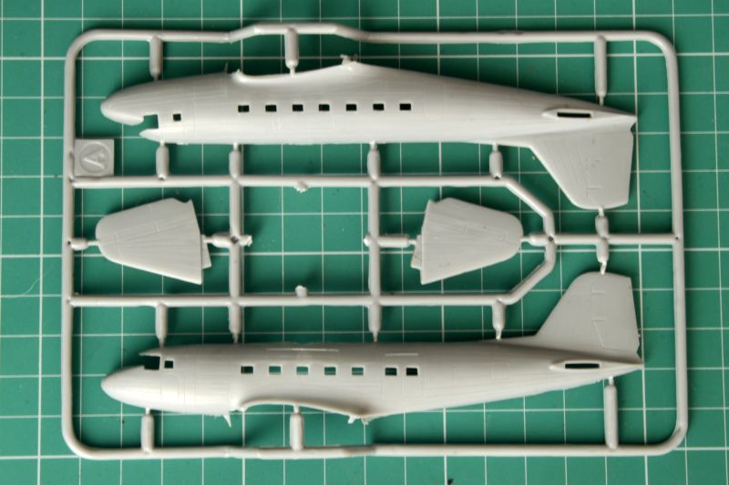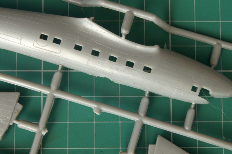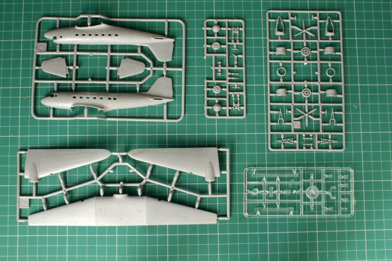 Pierwsza ramka to połówki kadłuba oraz usterzenie pionowe. Na drugiej znajdują się elementy płata. Podział jest tu klasyczny dwie połówki górnych powierzchni płata i jedna dolna, obejmująca także centropłat. Dwie pozostałe ramki to gondole silników, podwozie i trochę drobnych detali.