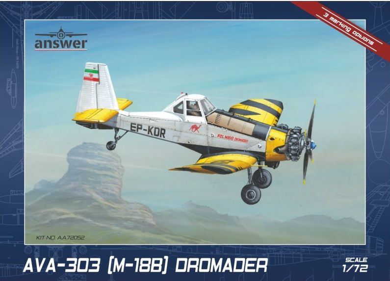 | Answer Plastic Kits: AVA-303 (M-18B) Dromader Skala: 1:72 Nr kat: 72052 Opcje malowania: 4 Typ modelu: model wtryskowy, elementy fototrawione, maski |