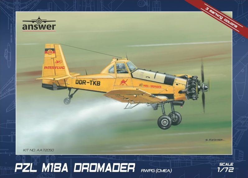 | Answer Plastic Kits: PZL M18A Dromader RWPG(CMEA) Skala: 1:72 Nr kat: 72050 Opcje malowania: 4 Typ modelu: model wtryskowy, elementy fototrawione, maski |