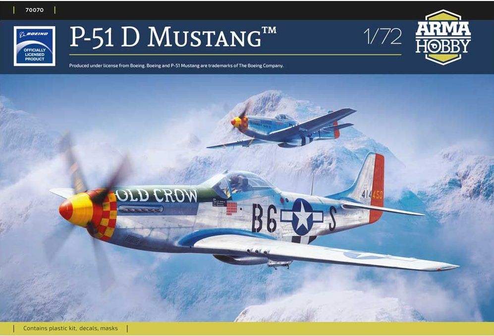 | ARMA HOBBY: P-51D Mustang Skala: 1:72 Nr kat: 70070 Opcje malowania: 3 Typ modelu: model wtryskowy, maski |