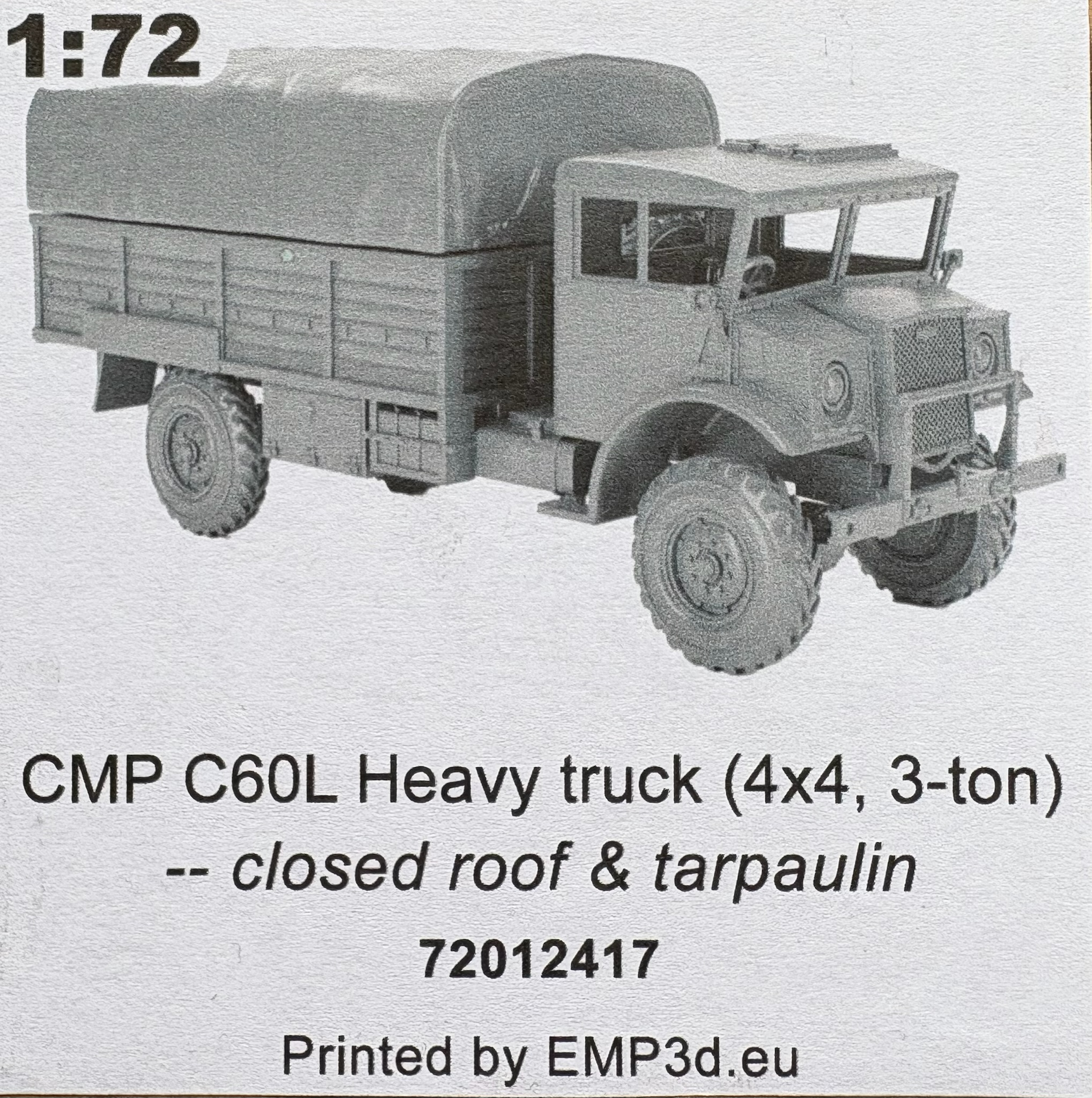 | EMP: CMP C60L Heavy truck (4x4, 3-ton) - closed roof & tarpulin Skala: 1:72 Nr kat: 72012417 Opcje malowania: - Typ modelu: wydruk 3D |