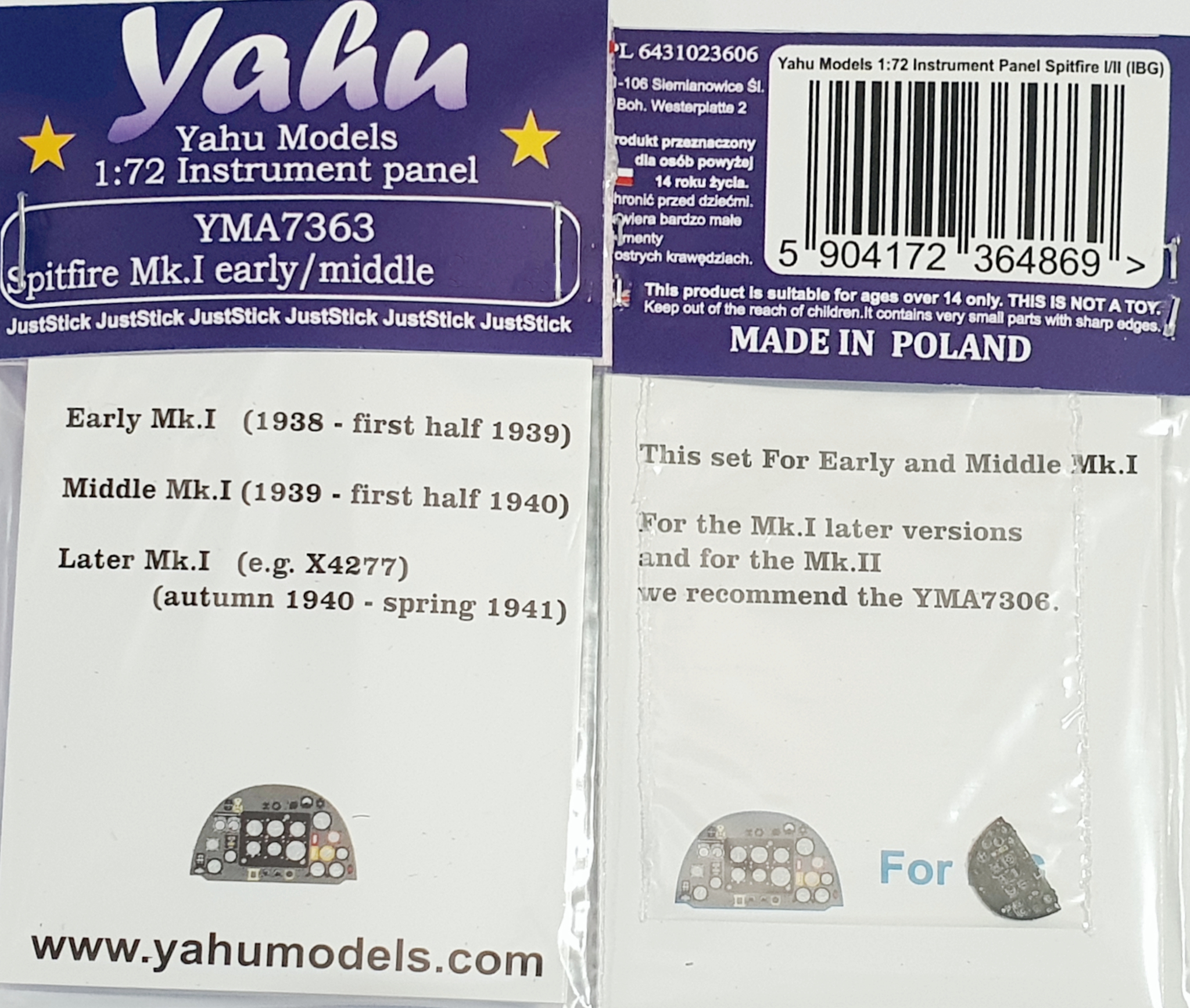 | Yahu Models: Spitfire Mk.I early/middle Skala: 1/72 Nr kat: YMA7363 Typ: elementy fototrawione Dedykowany do: IBG Models |