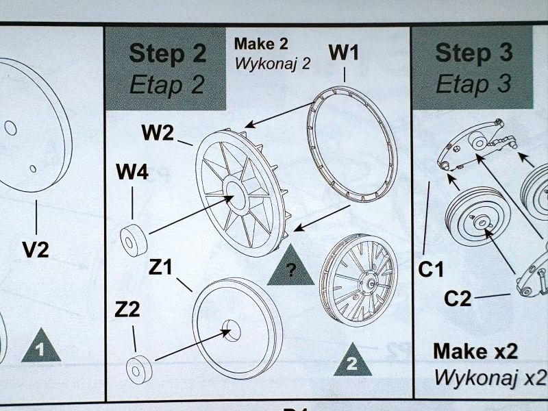 Jakie zaś są różnice? Jest to ramka oznaczona jako „Z”. Znajdziemy na niej elementy kół napędowych, i trzeba od razu zaznaczyć, że są to elementy alternatywne, o czym świadczą rysunki montażowe, ukazujące sposób wykorzystania zawartości wypraski. Przy okazji dowiadujemy się, jak wygląda instrukcja.