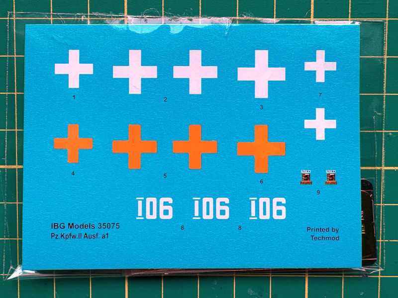 Ponieważ pozostałe wypraski, podobnie jak fototrawione blaszki są identyczne, jak w poprzednich zestawach z wersją A, przejdę od razu do kalkomanii. Średniej wielkości arkusik, na nim krzyże, numery i tabliczki znamionowe.
