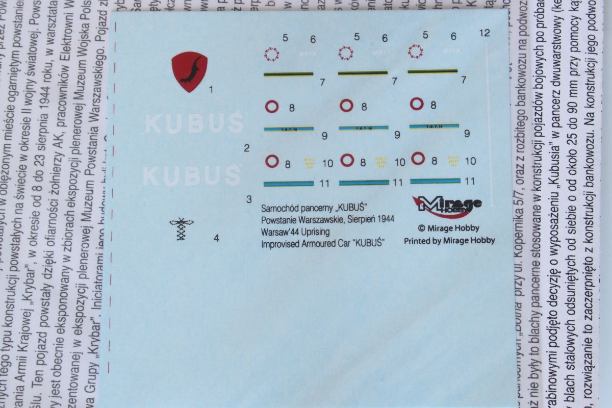 Na słowa uznania zasługuje natomiast instrukcja. Podzielona jest na dwie części. W pierwszej znajdziemy bardzo obszerny opis historii Kubusia, konstrukcje, udział w powstańczych walkach i dalsze dzieje, oraz kolorowy schemat malowania. Tabelę kolorów opracowano na podstawie palety Vallejo. Dysponujemy również, na co należy zwrócić uwagę, schematem rozmieszczenia przestrzelin, jakie pojawiły się na pancerzu Kubusia w wyniku działań wojennych. Cos dla lubiących ślady eksploatacji. Druga część instrukcji, już czarno – biała to schematy montażu. Opracowane czytelnie, dzięki czemu poszczególne etapy budowy nie powinny sprawić problemu.