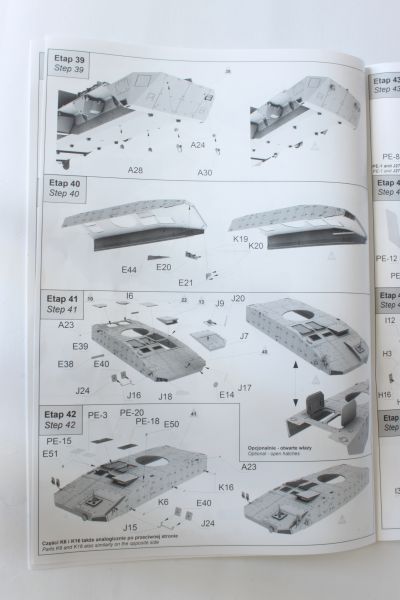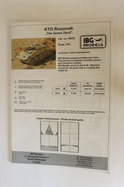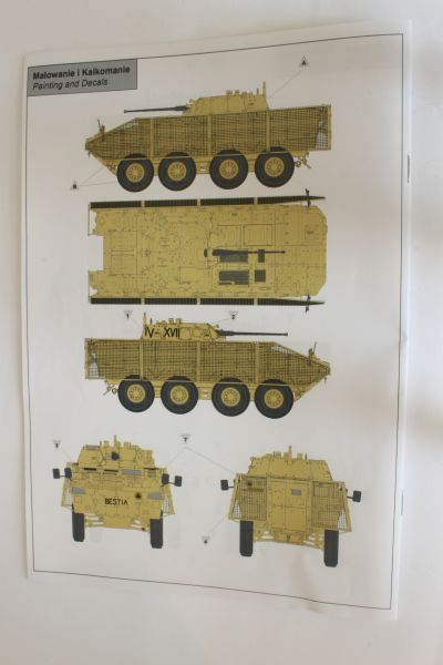 Instrukcja do modelu to książeczka formatu A4 wydrukowana na dobrej jakości papierze, zawierająca kolorowe schematy malowania (trzy wersje), przejrzyste schematy montażu i sugerowane numery farb do pomalowania modelu (Vallejo, AK Interactive oraz Hataka). Nie podane zostały szczegóły malowania wnętrza ale dokumentacja fotograficzna Rosomaków jest na tyle bogata, że nie powinno być z tym problemów. Pewnym minusem jest również brak dokładnych opisów wersji malowań.