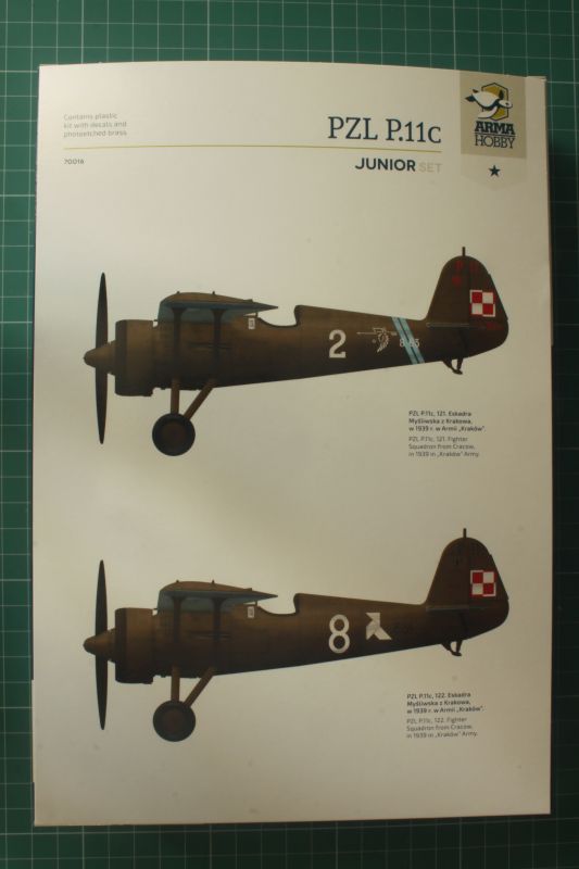 Model:PZL P.11c Junior Set, Nr kat.: 70016 Skala: 1:72 Producent: Arma Hobby Tworzywo: model wtryskowy plus elementy fototrawione, Malowanie: 2 x Polska, |