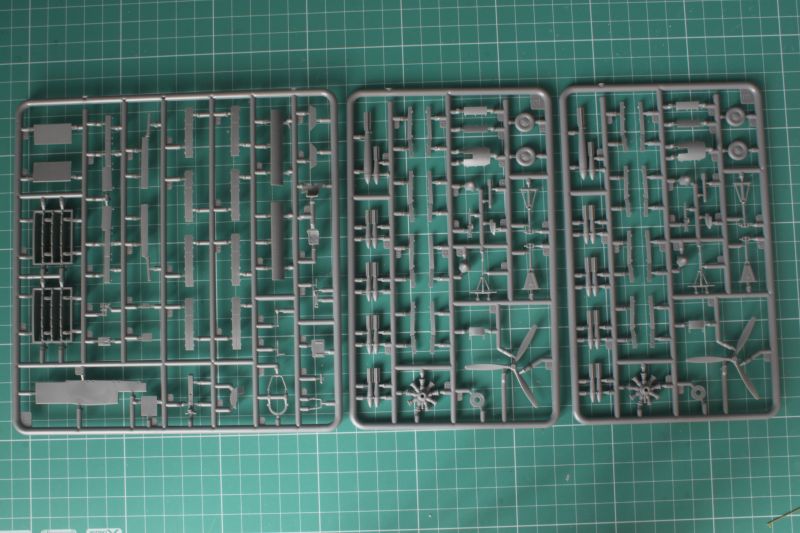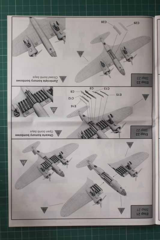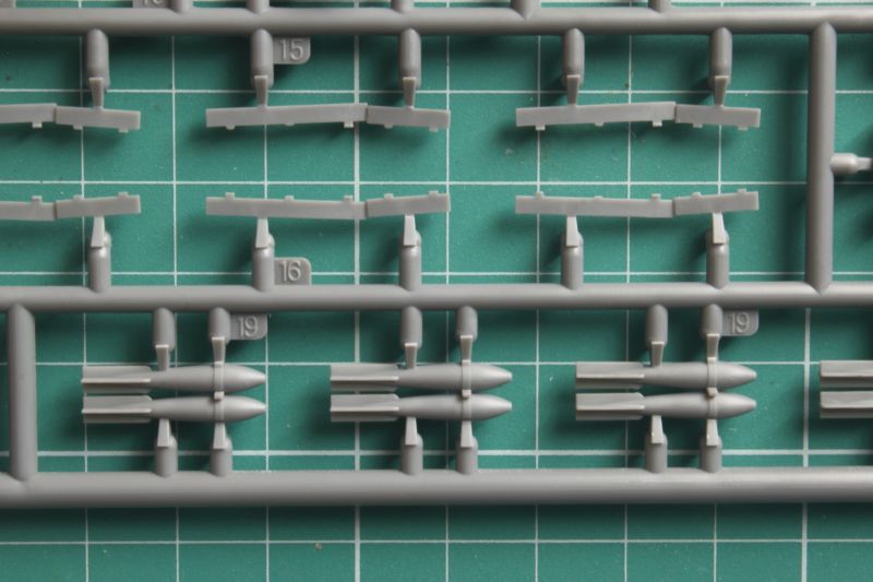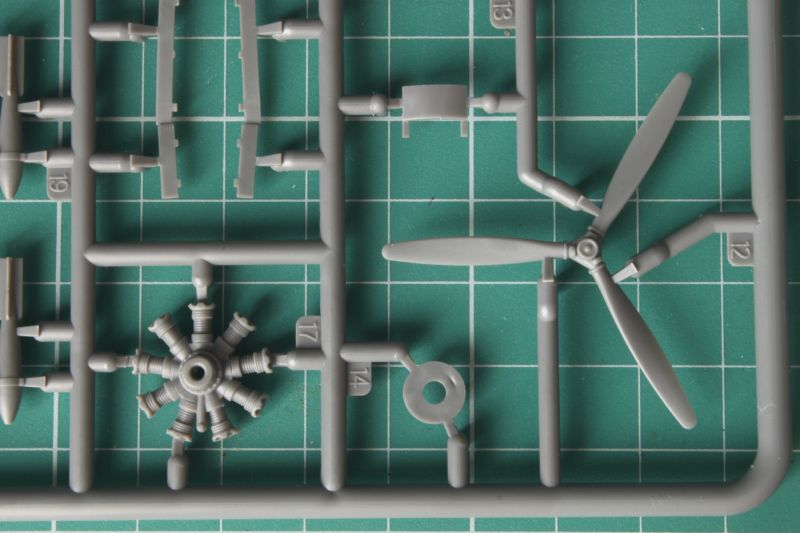 Kolejne dwie ramki (C i E - podwójne) to wyposażenie modelu, czyli detale kokpitu, komór bombowych silniki, śmigła i podwozie. Tu akurat do jakości wykonania nie ma się co czepiać, wszystko wykonane bez żadnych skaz wad i tego typu rzeczy. Warto zwrócić uwagę na to, że dysponujemy dwoma rodzajami goleni podwozia, dwoma rodzajami kołpaków, producent przewidział także oba typy karabinów maszynowych stanowiących uzbrojenie strzeleckie bombowca. Bomby natomiast rozmieszczono parami, co jest dobrym pomysłem, bo ułatwi nam montaż. A jak już mowa o bombach, to warto także zwrócić uwagę na pokrywy komór bombowych i luków podwozia. Są one cienkie i delikatne i maja zaznaczone zawiasy. Słyszałem, że w niektórych egzemplarzach zdarzały się uszkodzone, w moim na szczęście były całe. Może to wina niewłaściwego zabezpieczenia pudełka z modelem do wysyłki? No nie wiem. Spore grono modelarzy zarzuca firmie IBG, iż trochę po macoszemu traktuje tak ważny detal jak tablica przyrządów, dając jedynie kalkomanię, którą naklejamy na jeden z elementów. Ja jestem w stanie to zrozumieć, ponieważ początkującemu modelarzowi nie jest potrzebna tablica fototrawiona, zaś modelarz zaawansowany może ja zwaloryzować, co jest jednak mało prawdopodobne. Raczej posłuży się zestawem z Yahu, gdzie poza tablicą ma sporo innych fajnych rzeczy do wykorzystania w kabinie.