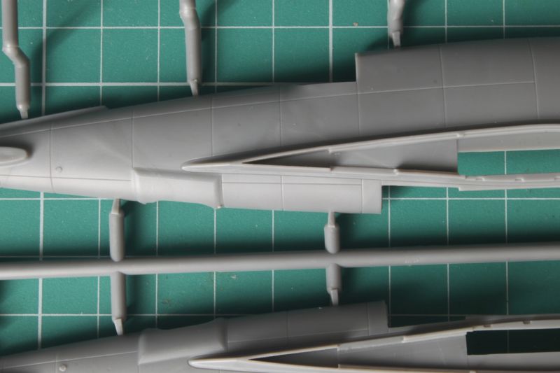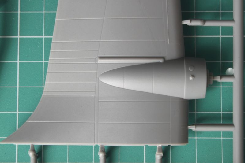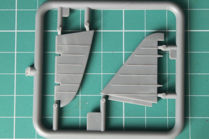 Kolejna rzecz jaka rozróżnia oba zestawy to usterzenie, pojedyncze w Łosiu A i zdwojone w Łosiu B. Producent opracował wszystkie powierzchnie sterowe jako dzielone, co bardzo cieszy. Tu jednak pojawia się pierwszy drobny grzeszek nowego modelu IBG, czyli zapadnięć tworzywa na powierzchni usterzenia pionowego. No fakt, jest coś takiego. Jedni będą z tego powodu męczyć klawiatury komputerów, inni po prostu wezmą szpachlówkę, klej cyjanoakrylowym czy cokolwiek innego czym da się wypełnić te jamki, a potem jak już stwardnieje usunąć nadmiar i doprowadzić do prawidłowego kształtu. Osobiście dowiedziałem się o tym zanim recenzowany zestaw dostałem, od razu zacząłem zastanawiać się jak poradzić sobie z tym problemem. Na razie wiem, że budowę modelu zacznę właśnie od tego. Do wypełnienia użyję pewnie płynnej szpachlówki Gunze. Do wyrównania konieczny będzie pewnie płaski, wąski pilnik, tak żeby nie uszkodzić brzechw wystających na powierzchni usterzenia. Tyle teoria, jak będzie w praktyce zobaczymy. Zresztą doświadczenie uczy, że za jakiś czas, kiedy formy się ustabilizują, te ramki wcale nie muszą występować. Poza tym różnice pomiędzy oboma zestawami dotyczą chłodnic, w wersji A są one pojedyncze a w B podwójne oraz kolektorów spalin które mają w obu wersjach inne kształty. Zaprojektowano je jako osobne ramki.