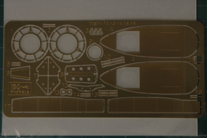 Oszklenie zostało w nowym modelu Łosia wykonane w sposób wręcz koncertowy. Trzeba przecież pamiętać, że było go dużo. „Szkło” to kolejna ramka, na której umieszczono elementy oszklenia kabin, światła pozycyjne, reflektor do lądowania i boczne okienka z przeznaczeniem do kolejnych wersji. Oszklenie jest cieniutkie i idealnie przejrzyste, czyli cały trud włożony w stanowisko dowódcy nie pójdzie na marne. Osłony kabin pilota i strzelca możemy wykonać jako otwarte – osłona kabiny pilota jest dzielona. Jako przeszklone wykonano także klosze świateł pozycyjnych, co będzie przecież miało wpływ na ostateczny wygląd miniatury.Aby tradycji stało się zadość, IBG Models zaopatruje swoje modele w fototrawione blaszki. Tak jest i tym razem. Na dołączonej do zestawu blaszce znajdziemy przede wszystkim wnęki luków podwozia, elementy silników, celowniki do km-ów, pasy i trochę drobnych detali wyposażenia, co powinno uatrakcyjnić wygląd modelu. Blaszki dołączone do obu zestawów są identyczne.