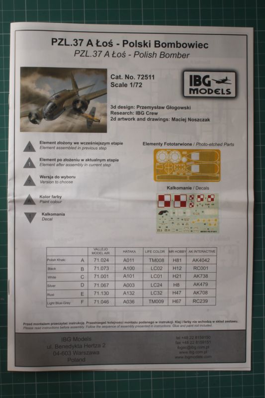 Model: PZL 37A Łoś - Polish Medium Bomber Nr kat.: 72511 Skala: 1:72 Producent: IBG Models Tworzywo: model wtryskowy, elementy fototrawione Malowanie: 2 x Polska |