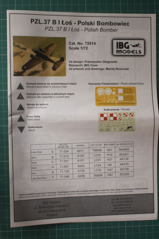Model: PZL 37B I Łoś - Polish Medium Bomber Nr kat.: 72514 Skala: 1:72 Producent: IBG Models Tworzywo: model wtryskowy, elementy fototrawione Malowanie: 2 x Polska |