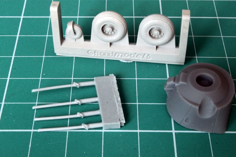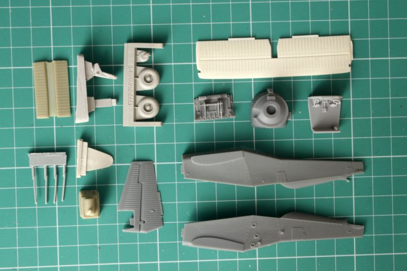 Podstawowe elementy modelu zapakowano w trzy woreczki strunowe. W pierwszym, większym znajdujemy elementy kadłuba, kokpitu, usterzenie, koła i trochę detali. Koła odlano bardzo ładnie, maja bieżnik i pięknie zdetalowane piasty. Także przednia część kadłuba ma wszystko, co potrzeba, poza dwoma liniami podziału w ścianie ogniowej z lewej strony, można przeryć lub nie. Ja raczej poprawię.