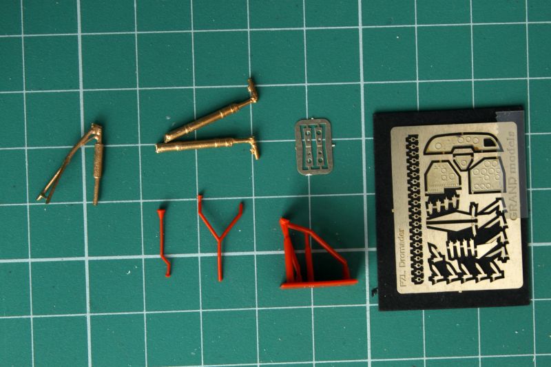 Podstawowe elementy, czyli żywica są uzupełnione multimediami, jak się to ładnie określa. Elementy fototrawione to obecnie standard i Grand Models się od tego nie wyłamują. Do swojego modelu Dromadera dołożyli dwie blaszki, jedną większą, na której znajdują się tablice przyrządów, mechanika płata i temu podobne drobne detale. Zabrakło natomiast pasów fotela pilota oraz całkiem sporej ilości uchwytów w rejonie osłony kabiny i przedniej części kadłuba. Z tymi ostatnimi należałoby jednak upewnić się, czy przypadkiem grackie maszyny tez mają takie uchwyty. Na szczęście dorobienie ich we własnym zakresie nie jest jakimś karkołomnym wyzwaniem. Tablice przyrządów wykonano jako jednolite panele, nie wykonano w nich otworów pod zegary, a tych nie znajdziemy na nawet na kalkomanii. Musimy się posiłkować zatem zapasami z podręcznego magazynku. Druga blaszka to z kolei widelce amortyzatorów goleni podwozia. Same golenie wykonano z metalu, zresztą bardzo ładnie. Są dosyć szczegółowe i co najważniejsze takie rozwiązanie jest idealne dla ciężkich, żywicznych skrzydeł. Podwozie takie się nie powinno złamać. Kolejna grupa detali to wykonane z pomarańczowego tworzywa stopnie ułatwiające wchodzenie do kabiny, drążek sterowy i rurka pitota. W taki sposób wykonano także jeden z detali urządzenia do zrzutu wody/chemikaliów. W Polskich Dromaderach jego kształt jest nieco inny niż przewidział to producent, więc koniczna będzie korekta.