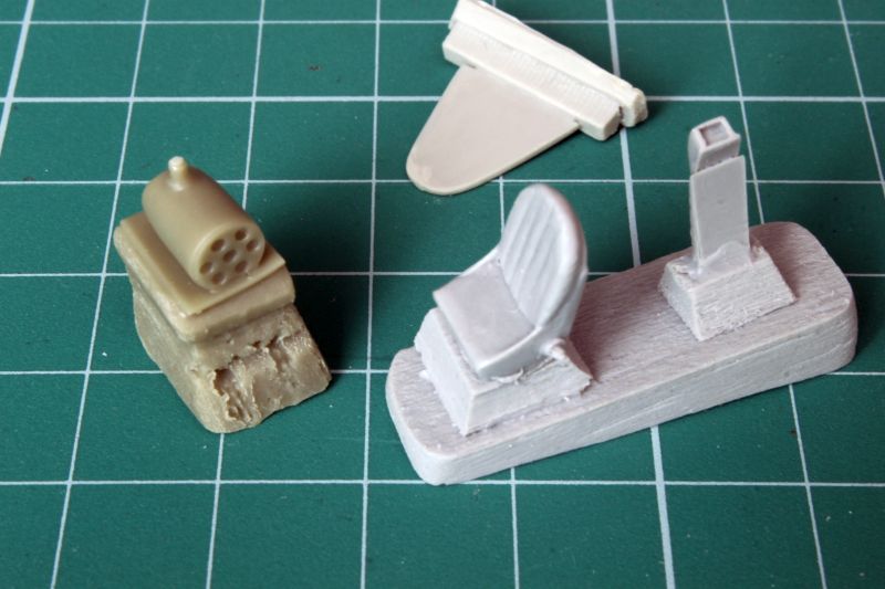 Ta sama uwaga dotyczy pozostałych detali kokpitu, czyli podłogi, fotela oraz zagłówka. Są one wykonane bardzo przyzwoicie, ale można wycisnąć z nich więcej, znacznie więcej, dodając brakujące panele przewody, czy dźwignie. Producent wyszedł najwyraźniej z założenia, że większość modelarzy nie będzie otwierać kokpitu. Na uznanie zasługuje natomiast urządzenie do zrzutu wody, czy tez chemikaliów, widoczne na zdjęciu po lewej. Jest to niezwykle precyzyjny i delikatny detal, do którego wystarczy jedynie dorobić kilka przewodów.
