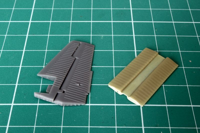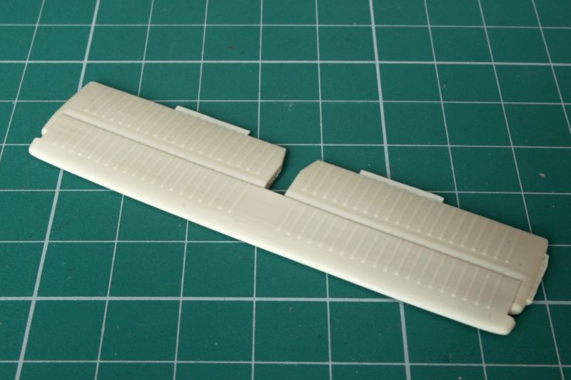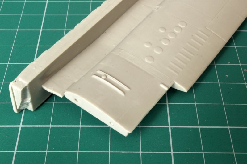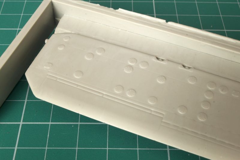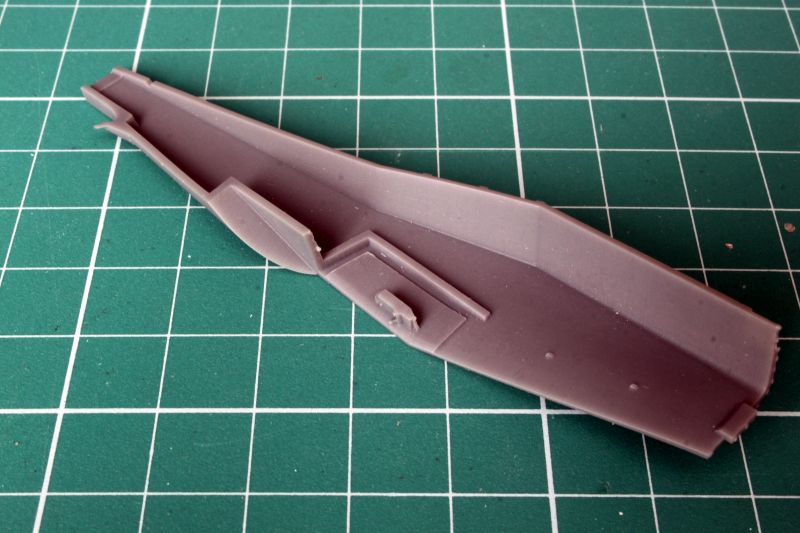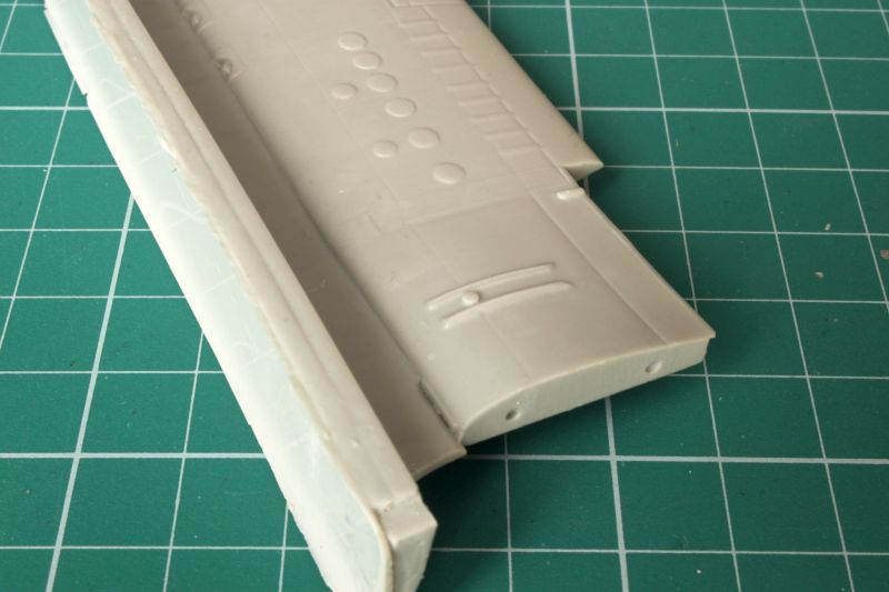 Skrzydła wykonano jako pojedyncze odlewy żywiczne, przy czym wlewy technologiczne znajdują się na krawędzi natarcia. Czeka nas zatem obróbka. Linie podziału są wklęsłe i bardzo delikatne, w niektórych miejscach zanikają. Także warto rozważyć przerycie ich na nowo. Tak czy inaczej, warto je przetrzeć drobnym papierem ściernym delikatnych rys znajdujących się na całej powierzchni. Na szczęście ładnie poddają się obróbce, sprawdziłem przy okazji pisania;) Także okrągłe pokrywy, których dość sporo jest zarówno na górnej jak i dolnej powierzchni płata, są nieco za bardzo wypukłe i przeszlifowanie ich powinno wyjść na dobre naszej replice. Trzeba także usunąć z górnej powierzchni płata szereg pionowych, krótkich listew, znajdujących się przy klapach. Znajdują się one tylko na dolnej powierzchni płatów. To właściwie jedyne uwagi, ale mając dobrą dokumentację, można pokusić się o odtworzenie także szeregu drobnych detali i wykonanie wszystkich powierzchni sterowych jako oddzielnych, jednak nie jako wychylonych. Wystarczy spojrzeć na zdjęcia oryginału. Ponieważ oba skrzydła to jednolite odlewy, które są dość ciężkie, warto wzmocnić ich mocowanie do kadłuba, np. jakimiś kawałkami drutu, a nie przyklejać ich na styk. W skrzydłach mamy zaznaczone otwory, które trzeba pogłębić, a w takich samych miejscach nawiercić otwory w kadłubie.