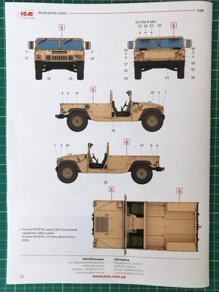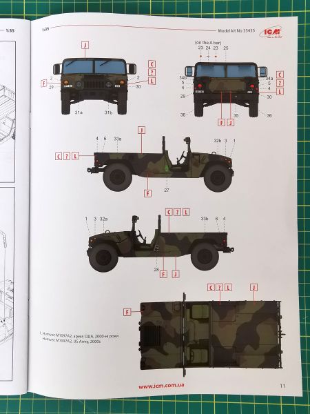 Producent przewidział dwie opcje malowania, obie to pojazdy amerykańskie. Jeden w standardowym kamuflażu NATO, drugi pustynny. Bez wskazywania przydziału do jakiś konkretnych jednostek. Schematy malowania mają jak to zwykle u ICM-u postać kolorowych plansz na końcu instrukcji.