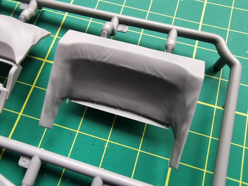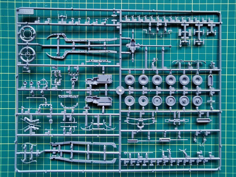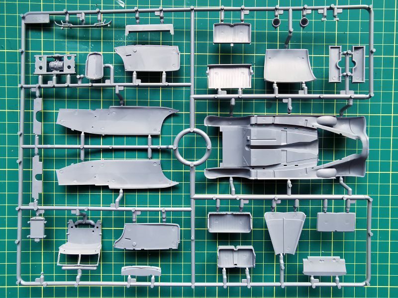 Zestaw składa się z trzech ramek z jasno szarego plastiku, odnośnie materiałów użytych do produkcji modelu oraz sposobu jego wydania nie zmieniło się tu kompletnie nic. Na ramce widocznej na zdjęciach znajdziemy głównie i wyposażenia kabiny. Ponieważ nie dysponuję jakąś bogatą dokumentacją ani oszałamiającą wiedzą na temat tego samochodu, postanowiłem skupić się na tym co mam przed sobą a nie dawać się w ocenę merytoryczną. Zestaw opracowano z dużą dbałością o szczegóły, nawet te najdrobniejsze. Detale wykonane wyraźnie i czysto. Producent nie przewidział możliwości wykonania drzwi, maski oraz pokrywy bagażnika w pozycji otwartej, co oczywiście nie znaczy, że się nie da. Musimy tylko popracować samodzielnie.