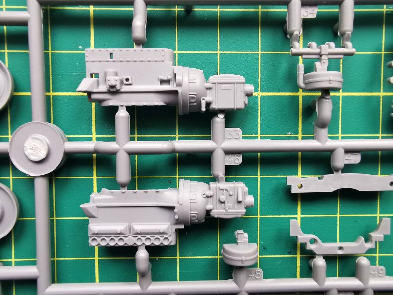 Druga ramka to podwozie, jednostka napędowa, układ przeniesienia napędu oraz trochę drobnych detali. Także tu nie ma żadnych uproszczeń i pójścia na skróty. Jeśli ktoś będzie chciał wyeksponować silnik, powinien we własnym zakresie dołożyć wiązki przewodów elektrycznych, paliwowych i temu podobnych. Warto też w tym celu zgromadzić jakąś dokumentację, żeby wiedzieć jak one przebiegały.
