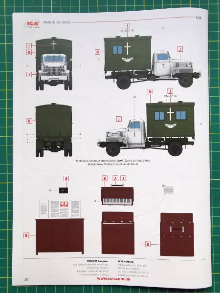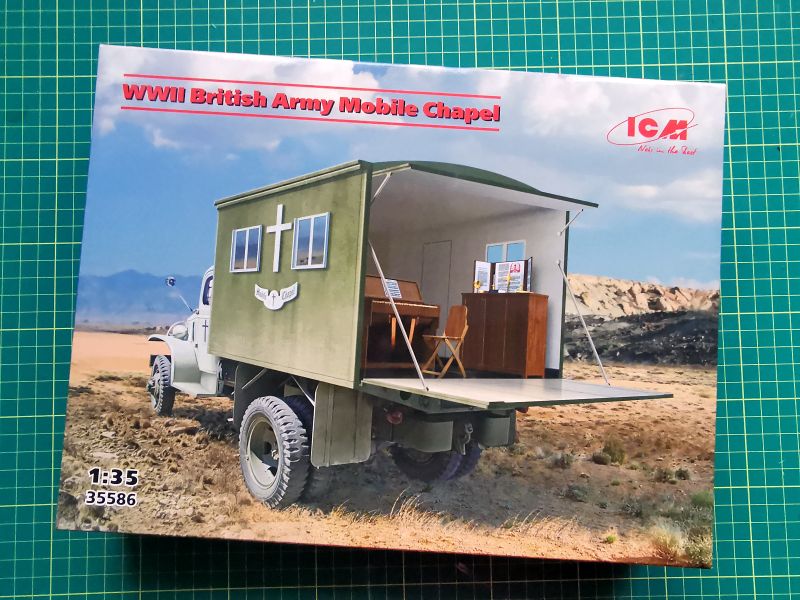 Przedstawia on ową mobilną kaplicę w surowym pustynno – górzystym otoczeniu, wszak owe kaplice były używane przez oddziały brytyjskie, walczące w Afryce Północnej. Tyle przynajmniej wydedukowałem z notatki umieszczonej w instrukcji. Czy były używane w późniejszym okresie, na przykład w Kampanii Włoskiej tego nie wiem. Sama konstrukcja mobilnej kaplicy powstała przez adaptację ciężarówki Chevrolet G7117. Po prostu zwykłą krytą „budę” przystosowano do roli kaplicy, dodając okna i odpowiednie oznakowanie, zaś w środku umieszczono wszystko, co było potrzebne do sparowania obrzędów religijnych.