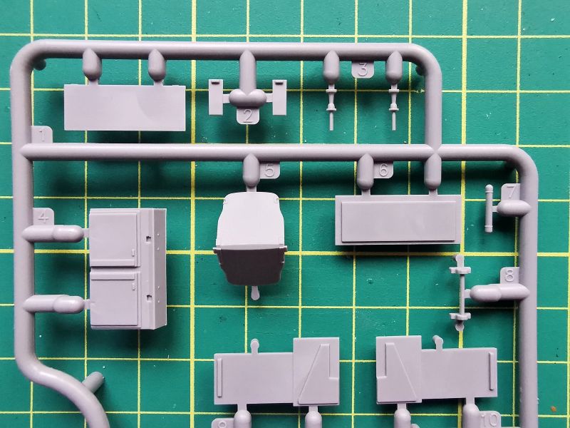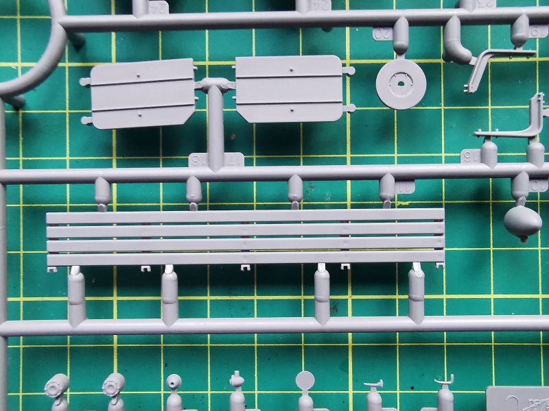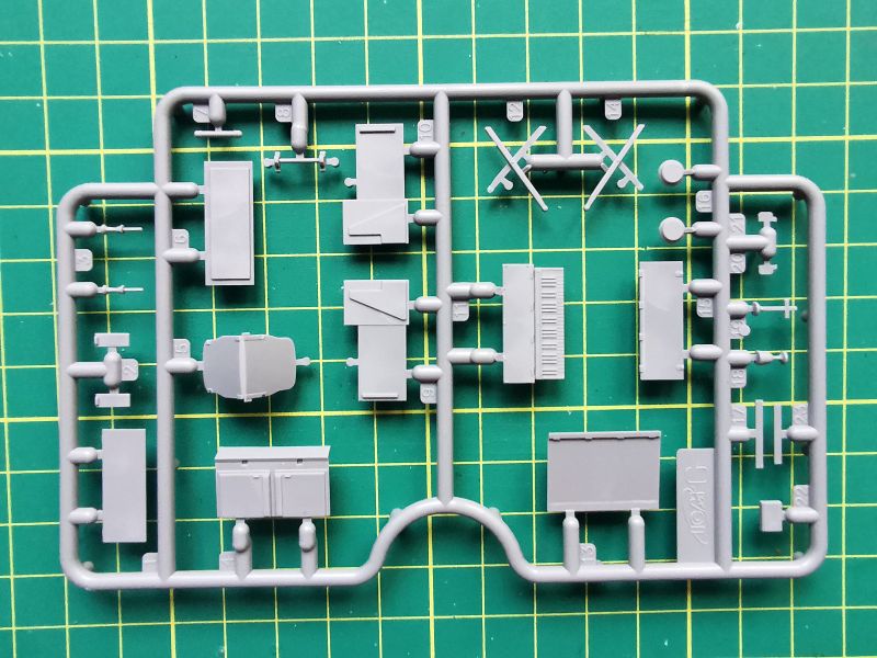 Ramka „G” to z kolei wyposażenie kaplicy, polowy ołtarz, przybory liturgiczne, organy, słowem wszystko co jest niezbędne do odprawienia nabożeństwa w obrządku anglikańskim. Podstawowe elementy modelu wykonano z jasnoszarego plastiku, przy czym ten zestaw w niczym nie odbiega od innych produktów ICM-u. Dobrze i szczegółowo wykonany, na wypraskach nie zauważyłem, żadnych nadlewek, jamek skurczonych, czy też innych niedoskonałości produkcji. Nie zauważyłem także śladów po wypychaczach.
