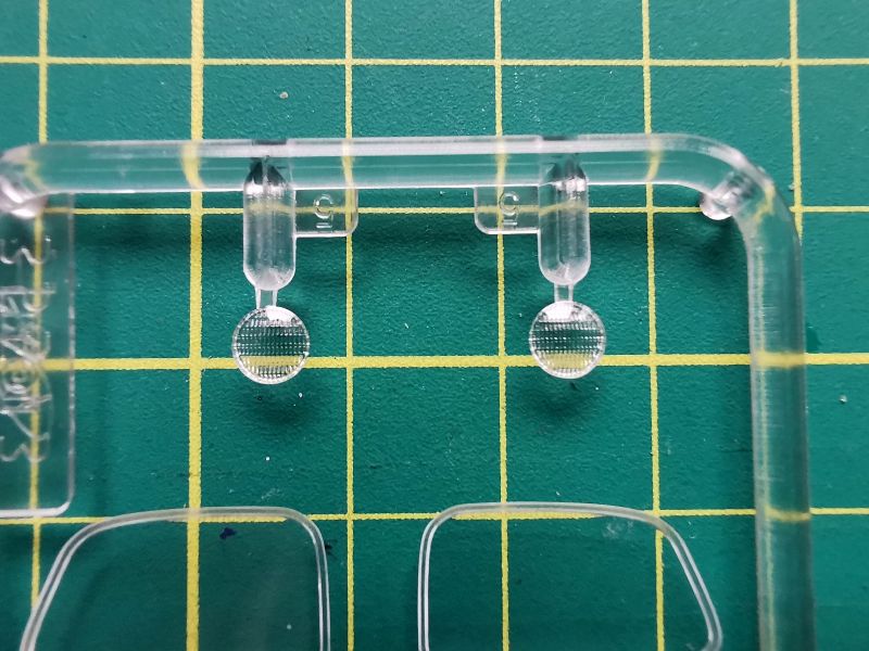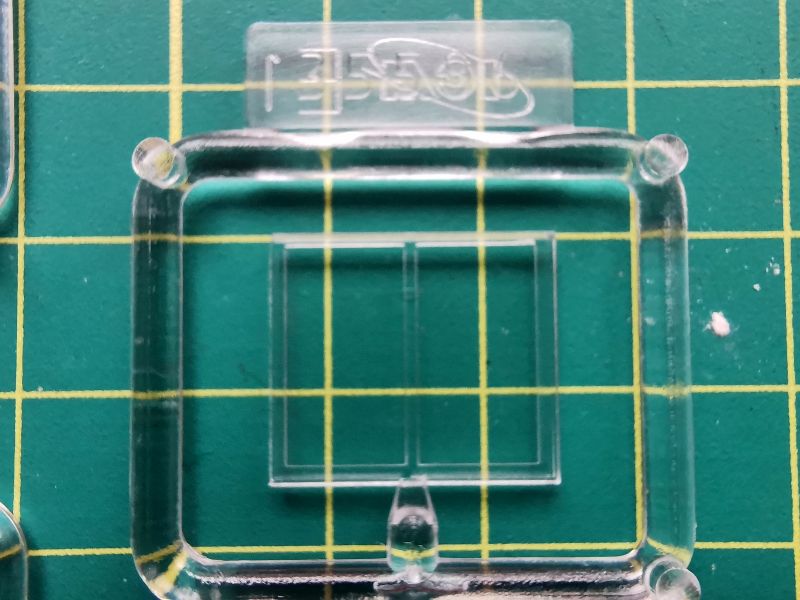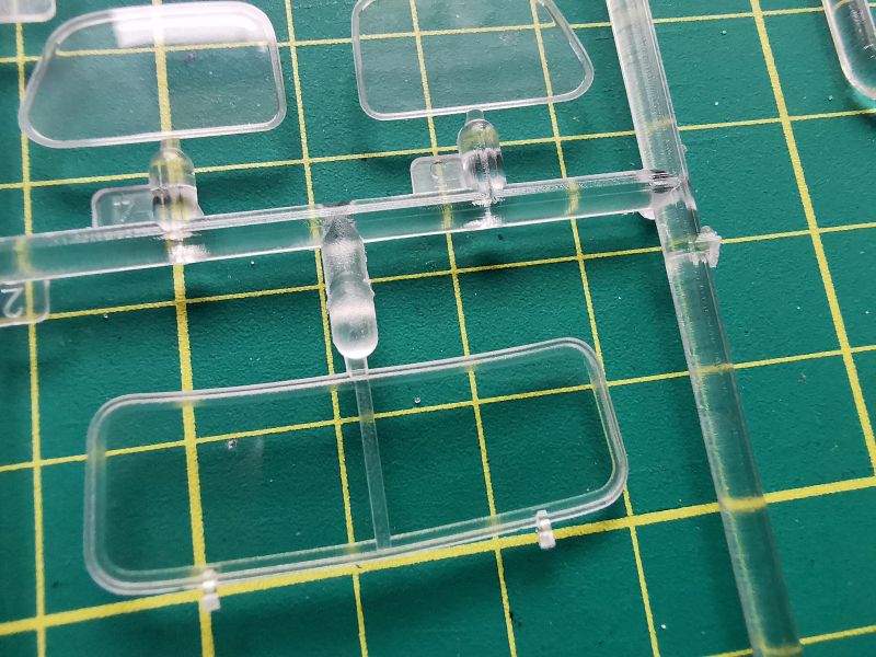 Uzupełnieniem omówionych powyżej elementów z tworzywa, są oczywiście detale przezroczyste. Są to w sumie cztery ramki, pierwsza większa zawiera szyby szoferki oraz klosze reflektorów, zaś trzy pozostałe, mniejsze to okna kaplicy. Oszklenie robi bardzo pozytywne wrażenie pod względem przejrzystości poszczególnych elementów. Nie mam im nic do zarzucenia.