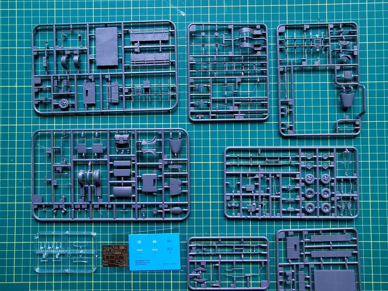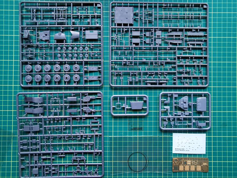 W stosunku do poprzedniego zestawu, czyli 72071 jedyna różnicą jest tutaj obecność niewielkiej ramki wtryskowej oznaczonej jako „E”. Znaleźć ją możemy w zestawach z Moultierami, a znajdują się na niej rama, trochę elementów układu wydechowego oraz błotniki. Tylko te ostatnie wykorzystamy w budowanym przez nas modelu. Pozostałe wypraski oraz fototrawiona blaszka są identyczne jak w zestawie 72071.