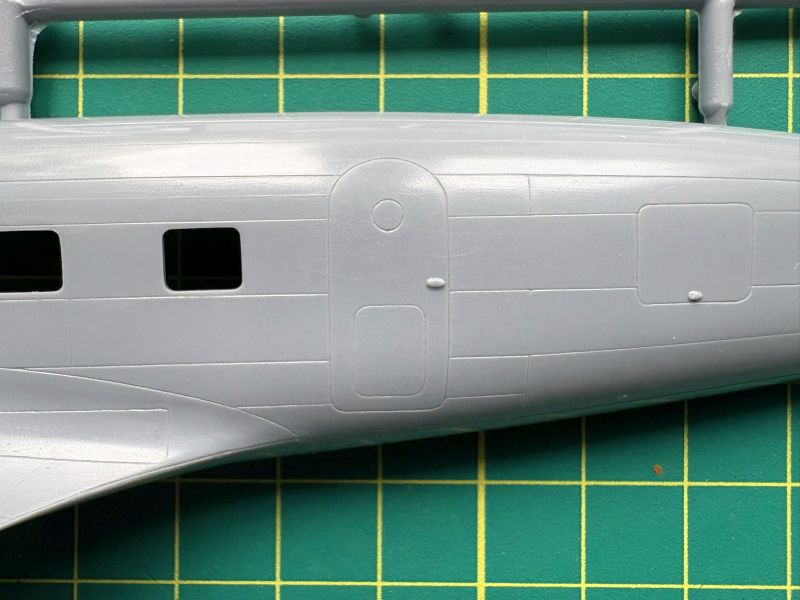 Trzecia wypraska to górne powierzchnie skrzydeł, dolna część centropłata, golenie podwozia oraz śmigła. Jest też trochę detali wnętrza, takich jak tablica przyrządów oraz sterownice. Co ciekawe, oglądałem już różne modele DC-3, C-47 i teraz DC-2. Wszystkie miały w identyczny lub bardzo podobnie rozwiązany podział technologiczny skrzydeł. Wynikało to zapewne z wniosku jaki skrzydła mają tuż za gondolami silników. Większość z tych modeli miała także powierzchnie sterowe wykonane jako elementy skrzydeł i usterzenia. Nie były one dzielone. Ten zestaw nie jest wyjątkiem. Wnętrze kadłuba jest potraktowane raczej symbolicznie. Projektant zestawu nie przewidział możliwości wykonania drzwi w pozycji otwartej, więc kabina pasażerska ma tylko podłogę oraz ścianki z przodu i z tyłu. Nieco lepiej jest w kabinie pilotów, ale jeżeli ktoś chce mieć całe wnętrze kadłuba, musi sobie poradzić sam.