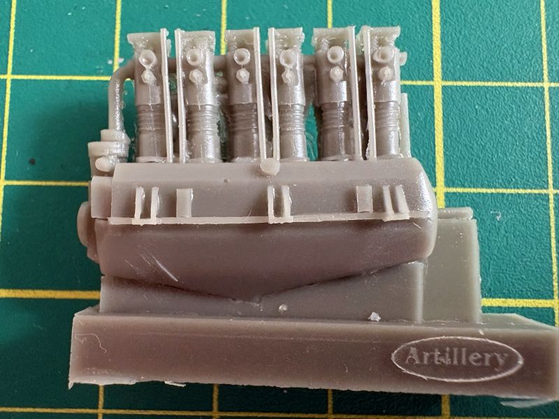 Powyżej określiłem ten zestaw jako klasyczny short – run. Dotyczy to także faktu, uzupełnienia elementów polistyrenowych detalami z żywicy. Dla firmy Fly detale te wykonuje podwykonawca, firma Artillery. W przypadku tego modelu, w formie odlewów żywicznych wykonano makietę silnika wraz z kolektorem spalin i układem wydechowym oraz trochę drobnych detali. Co ciekawe, instrukcja nie przewiduje zastosowania pięknego wydechu z żywicy a wykorzystanie znacznie słabszego elementu z tworzywa. Są one praktycznie identyczne. O co tu chodzi na razie nie wiem, będę o tym myślał, kiedy model znajdzie się już na warsztacie.