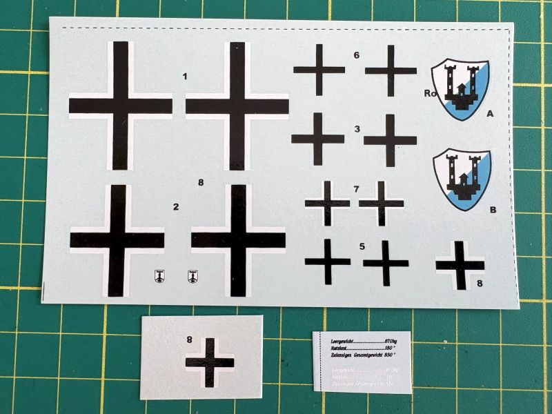 Kalkomania to w sumie pięć arkuszy i arkusików, bo są one różnej wielkości. Trzy pierwsze, najmniejsze to krzyże, godła oraz coś w rodzaju stencili. Instrukcja jednak nie precyzuje, gdzie należy ich użyć. Kolejna zagadka do rozwiązania podczas budowy. Miałem już do czynienia z kalkomaniami Fly 814. Nie mam zastrzeżeń do ich strony technicznej, ale trzeba z nimi uważać, bo są dość delikatne.