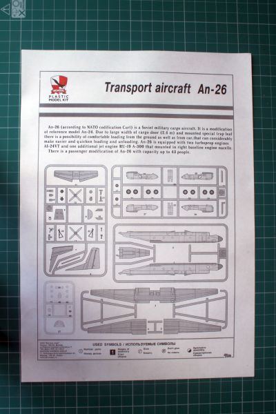 Zestaw do budowy modelu Ana-26 składa się czterech ramek wykonanych z jasnoszarego polistyrenu i jednej przezroczystego tworzywa. Jakość jest typowa dla modeli Estern Expressu. Jest to niezłej jakości short run w którym mamy trochę szczegółów i trochę uproszczeń zarazem. Linie podziału są wgłębne, delikatne, ale wyraźne i równo poprowadzone. Także takie rzeczy jak podwozie czy śmigła są wykonane poprawnie. Nie zaobserwowałem także jamek skurczowych czy innych skaz, no może trochę nadlewek, ale są one łatwe do usunięcia. Co ciekawe, sposób opracowania tylnej części kadłuba, dale mozliwość wykonania rampy ładunkowej w pozycji otwartej. Jednakże szczegóły tej rampy, oraz wnętrze kadłuba musimy wykonać we własnym zakresie. Szkło także nie budzi zastrzeżeń.