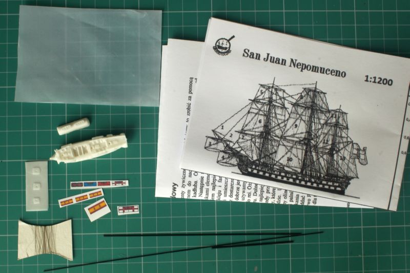 Zestaw umożliwiający budowę jednego z najbardziej znanych hiszpańskich liniowców to wykonane z żywicy kadłub, łodzie ratunkowe oraz marsy. Trzeba przyznać, że z każdym modelem Mikrostocznia poprawia jakość swoich wyrobów, znacznie mniej czasu wymaga obróbka kadłuba, praktycznie wystarczy obrobić pilnikiem linię wodną i pogłębić otwory na maszty. Te, wykonano z prętów węglowych, jak w przypadku kolejnych zestawów. Tradycyjnie dołączono cienka nić na wykonanie olinowania a także kawałek impregnowanej tkaniny na wykonanie żagli. Nowością są bandery wydrukowane na papierze samoprzylepnym, nie jestem tylko pewien, czy dwie warstwy papieru nie będą za grube, jak na tak małą skalę. Warto jednak zwrócić uwagę, że poza hiszpańskimi mamy tu także bandery brytyjskie, jeśli ktoś chciałby zrobić swoją miniaturę z okresy służby w Royal Navy jako HMS "San Juan". W instrukcji znajdziemy krótki opis historii okrętu, możemy przeczytać także o bohaterskiej postawie załogi liniowca w bitwie pod Trafalgarem, oraz rysunki montażowe, szablony czyli wszystko, co będzie nam potrzebne do budowy miniatury Napomucena.
