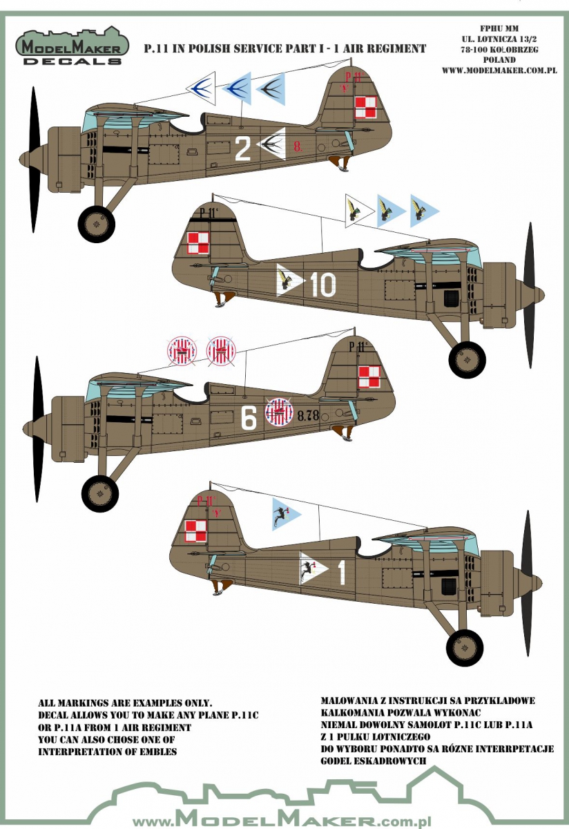 Na początek coś dla miłośników PZL P.11c. Ukazała się pierwsza część jak to określa producent "Sagi o 11-tce". Dotyczy ona maszyn używanych w 1 Pułku Myśliwskim, a można wykonać w oparciu o te kalkomanie model praktycznie dowolnego samolotu używanego w tej jednostce. Warto zwrócić uwagę na wręcz wzorową współpracę firmy ModelMaker Decals z modelarzami i entuzjastami. Po opublikowaniu w zapowiedziach tego właśnie zestawu, firma otrzymała dużo materiału ikonograficznego, co zaowocowało dokonaniem korekt w projekcie, co tylko wyszło na dobre. Kalkomanie dostępne są w skalach 1/48 i 1/72.