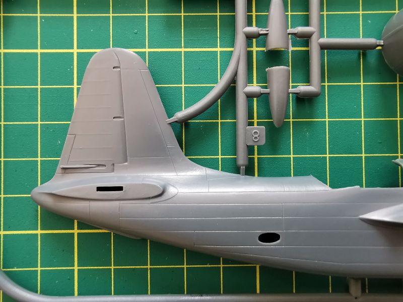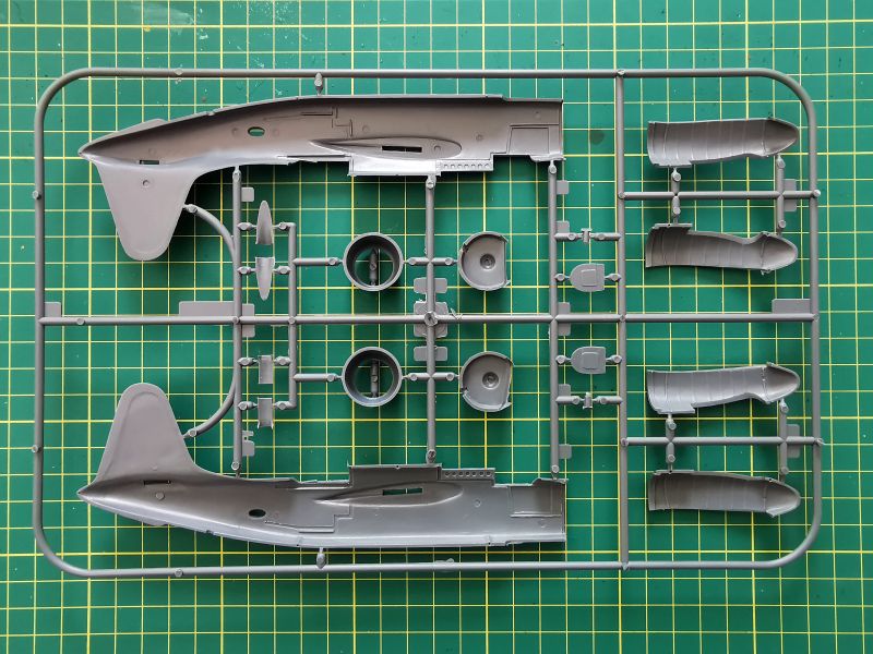 Zestaw składa się z pięciu ramek wtryskowych, wykonanych z szaroniebieskiego polistyrenu, charakterystycznego dla większości nowych modeli Eduarda oraz niektórych, zwłaszcza tych nowszych modeli Spceial Hobby. Ramka „A” to połówki kadłuba oraz gondole silników. Kadłub ma klasyczny podział na lewą i prawą połówkę do której dokleimy część nosową, która w tym wypadku jest w całości przeszklona. Linie podziału są wgłębne, ale równe i wyraźne, takie jak doskonale znamy z innych modeli opracowanych przez Special Hobby. Najbardziej charakterystyczną cechą wyróżniającą DB-7 od innych samolotów z tej rodziny jest statecznik pionowy, nieco mniejszy i bardziej szpiczasty. Zostało to oczywiście uwzględnione, jak i inne różnice cechujące francuską odmianę słynnego bombowca. Ster kierunku nie jest natomiast odrębnym elementem. Zarówno wewnątrz kadłuba, jak i gondoli silnikowych znalazły się imitacje wewnętrznej konstrukcji płatowca. Jeżeli przyjdzie mi skleić ten model, na pewno dodam coś od siebie. Nie jest to w żadnym wypadku przytyk w stronę producenta, po prostu lubię detalować te miejsca po swojemu.