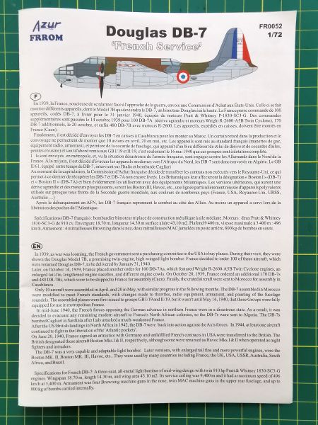 Najnowsza propozycja francuskiej firmy Azur Frrom to ani Fiarey Battle ani też Bloch MB 210. Na te modele przyjdzie nam jeszcze trochę poczekać. Do premier tych zestawów pewnie już bliżej niż dalej. Na razie pojawiła się inna propozycja, wręcz wrzutka w postaci modelu średniego bombowca DB-7. Tej konstrukcji także nikomu nie trzeba przedstawiać, bo to z niej wywodzi się cała rodzina samolotów bombowych i szturmowych A-20, szerzej znanych jako Boston lub Havoc. Ponieważ producent uczynił mi ten honor, powierzając egzemplarz testowy, nie będę tracić czasu i od razu przejdę do przedstawienia zawartości pudełka.
