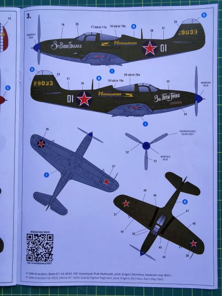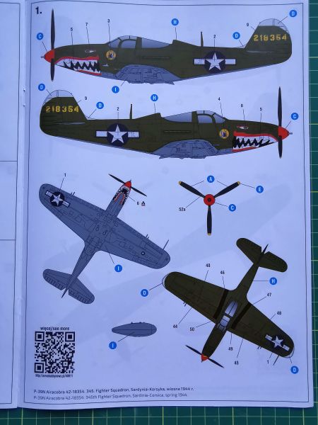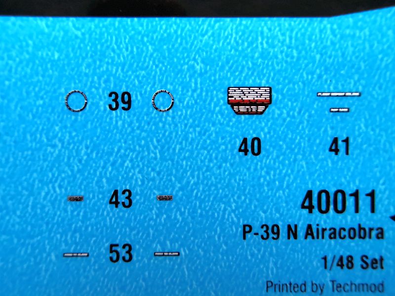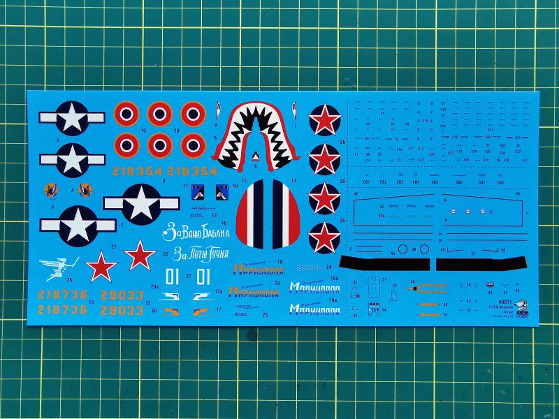Ponieważ zarówno elementy przezroczyste, maski oraz balast są identyczne jak w P-39Q Od razu przejdę do omawiania kalkomanii. Jest to spory, podłużny arkusz, na którym sporo się dzieje. Znaki, numery, godła no i oczywiście paszcza zostały uzupełnione kompletem napisów eksploatacyjnych i tradycyjnie kalkomaniami do umieszczenia w kokpicie. Wszystko wydrukowane wyraźnie z prawidłową kolorystyką, a nawet najdrobniejsze napisy można przeczytać. Nie ma też żadnych błędów drukarskich. Tym razem drukiem kalkomanii zajął się nasz rodzimy Techmod. Jeśli chodzi o ich stronę techniczną, to jestem raczej spokojny. Wiele razy korzystałem z tych kalkomanii i nie miałem z nimi najmniejszego problemu.