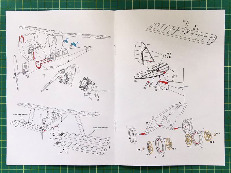 Instrukcja jest identyczna dla wszystkich czterech zestawów. Ma ona postać wydanej na papierze kredowym broszury. Jej większą część zajmują czytelne, wykonane w sposób klasyczny rysunki instrukcyjne, które obejmują wszystkie warianty samolotu. Dowiemy się jak zamontować oba typy silników, jak postawić samolot na kołach, a jak na pływakach.