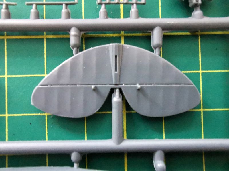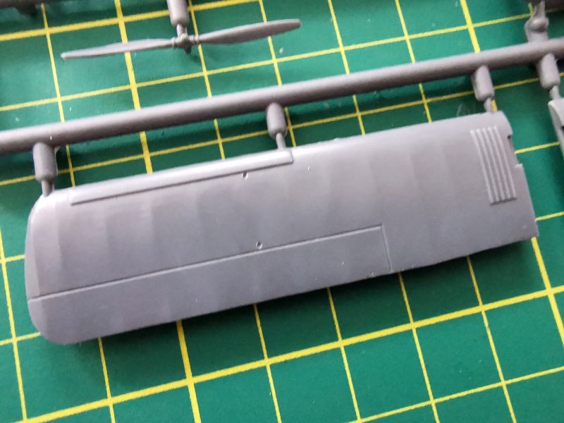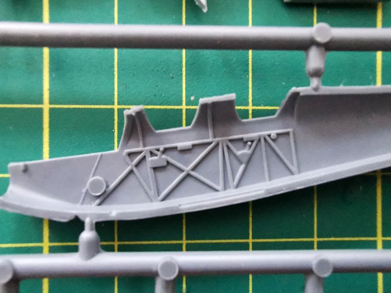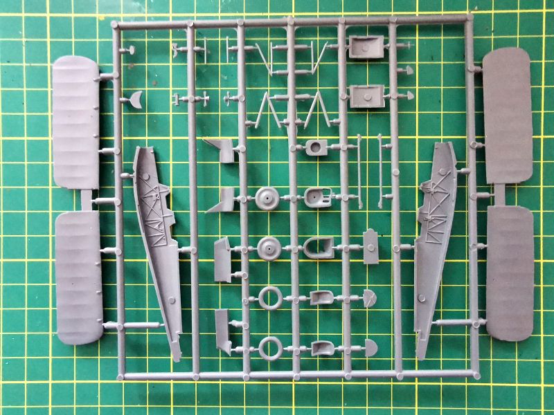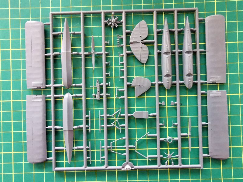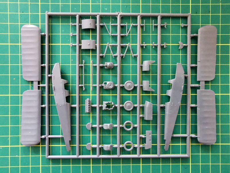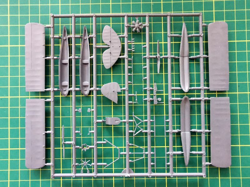 Podstawowe elementy modelu znajdują się na dwóch wypraskach wykonanych z szarego polistyrenu. Na pierwszy rzut oka robią sympatyczne wrażenie, jest to short run, ale wykonany współcześnie, nie wiem czy cyfrowo, ale na bardzo dobrym poziomie, o czym może świadczyć na przykład kadłub. Sporo precyzyjnie odtworzonych detali zewnętrznych, sporo także dzieje się wewnątrz. Jedynie brak kołków pozycjonujących przypomina o technologii wykonania modelu. Z przodu montujemy alternatywne elementy w zależności od wyboru wersji silnikowej. Jeżeli wybierzemy silnik gwiazdowy, przednią część kadłuba należy odciąć. Równie pozytywne wrażenie co kadłub robią wszystkie powierzchnie kryte płótnem, na tej ramce znalazł się górny płat. Mamy do wyboru jego wersję z e slotami lub bez. Opłótnienie wykonane jest w sposób subtelny, bez przegięć w żadną stronę. Także wszelkie drobne detale zostały odtworzone dokładnie i wyraźnie. Uproszczona jest jedynie makieta silnika rzędowego, bo do dyspozycji mamy jedynie górną i przednią jego część. Jeżeli ktoś chciałby wykonać go w pozycji otwartej, musi postarać się o jakiś zamiennik, lub czeka go trochę pracy samodzielnej.