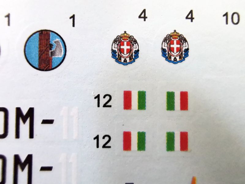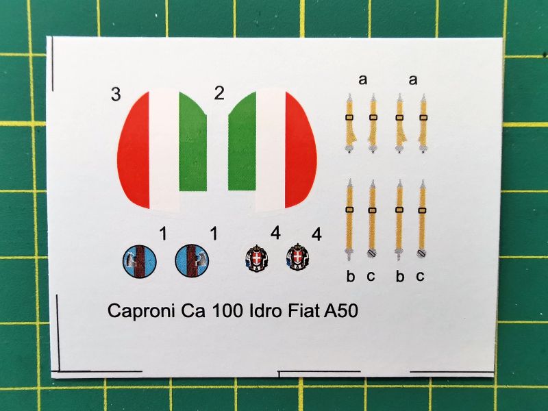 Jak zaznaczyłem powyżej, jedyne różnice pomiędzy poszczególnymi zestawami to kalkomanie i propozycje malowania. Na początek odmiany pływakowe. W przypadku wersji z silnikiem rzędowym, do wyboru mamy aż cztery warianty, trzy historyczne i jeden współczesny - ten oznaczony jako pierwszy. Ta ilość opcji przełożyła się oczywiście na wielkość arkusza kalkomanii, jest on średniej wielkości w przeciwieństwie do tego, jaki znajdziemy w pudełku z odmianą pływakową z silnikiem rzędowym. Tu jest tylko jeden wariant. W przypadku obu odmian pływakowych do wyboru mamy tylko malowania włoskie cywilne i wojskowe.